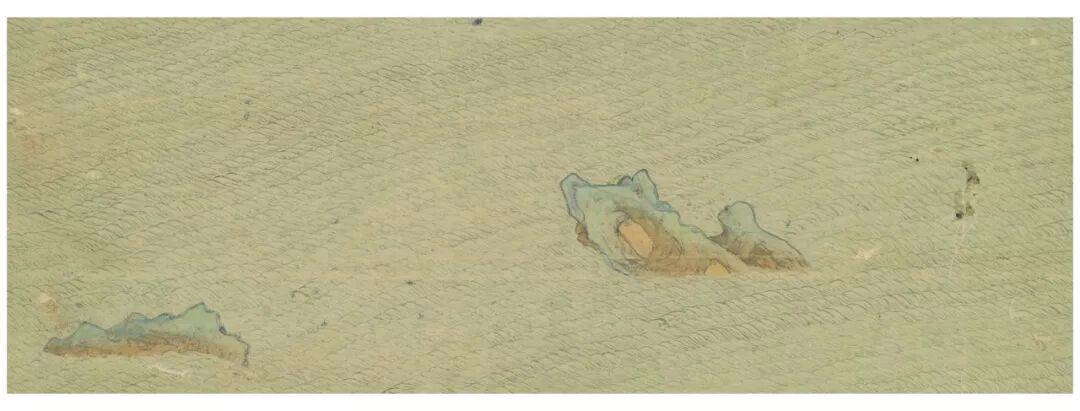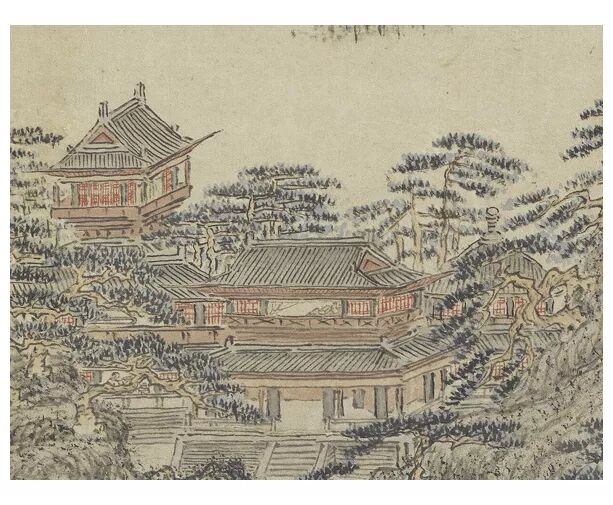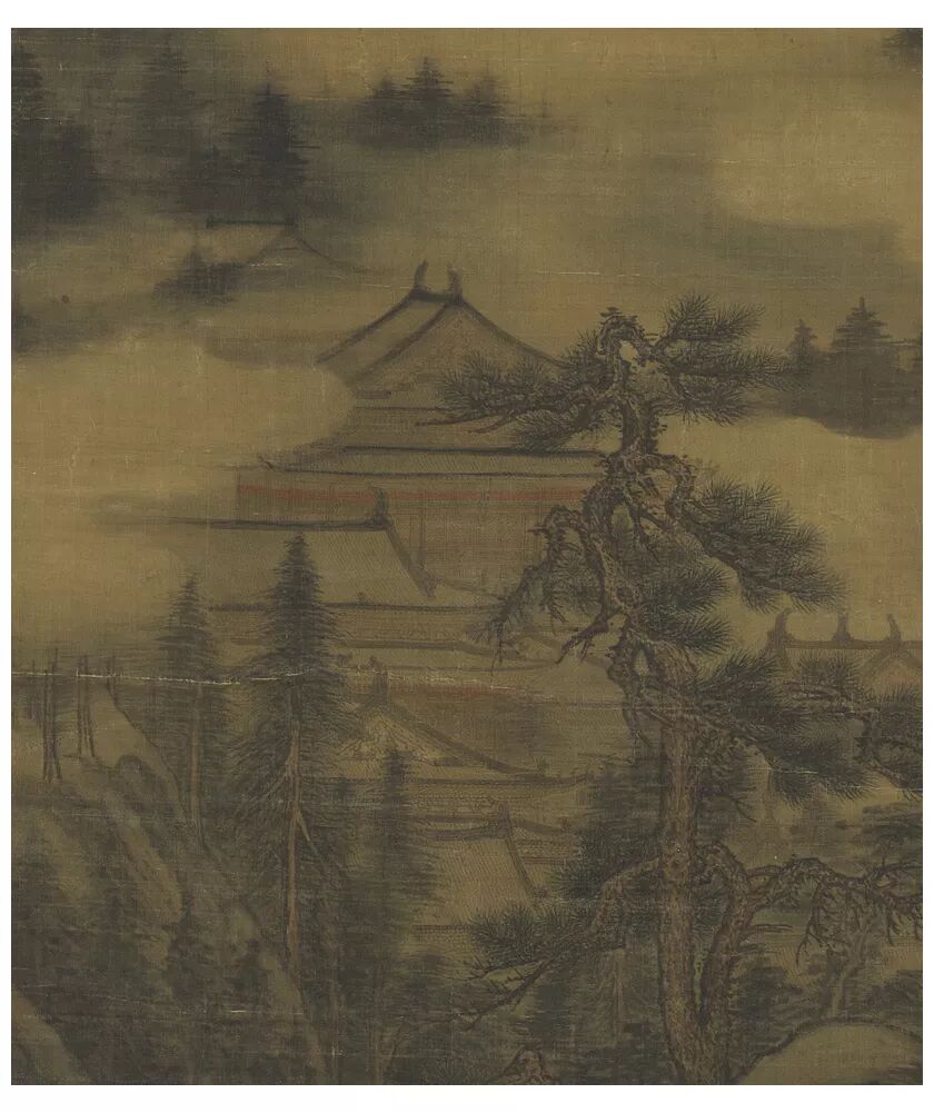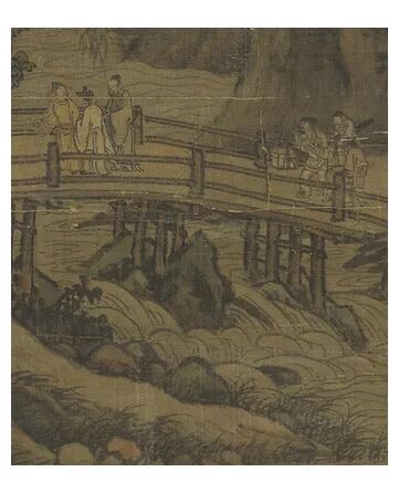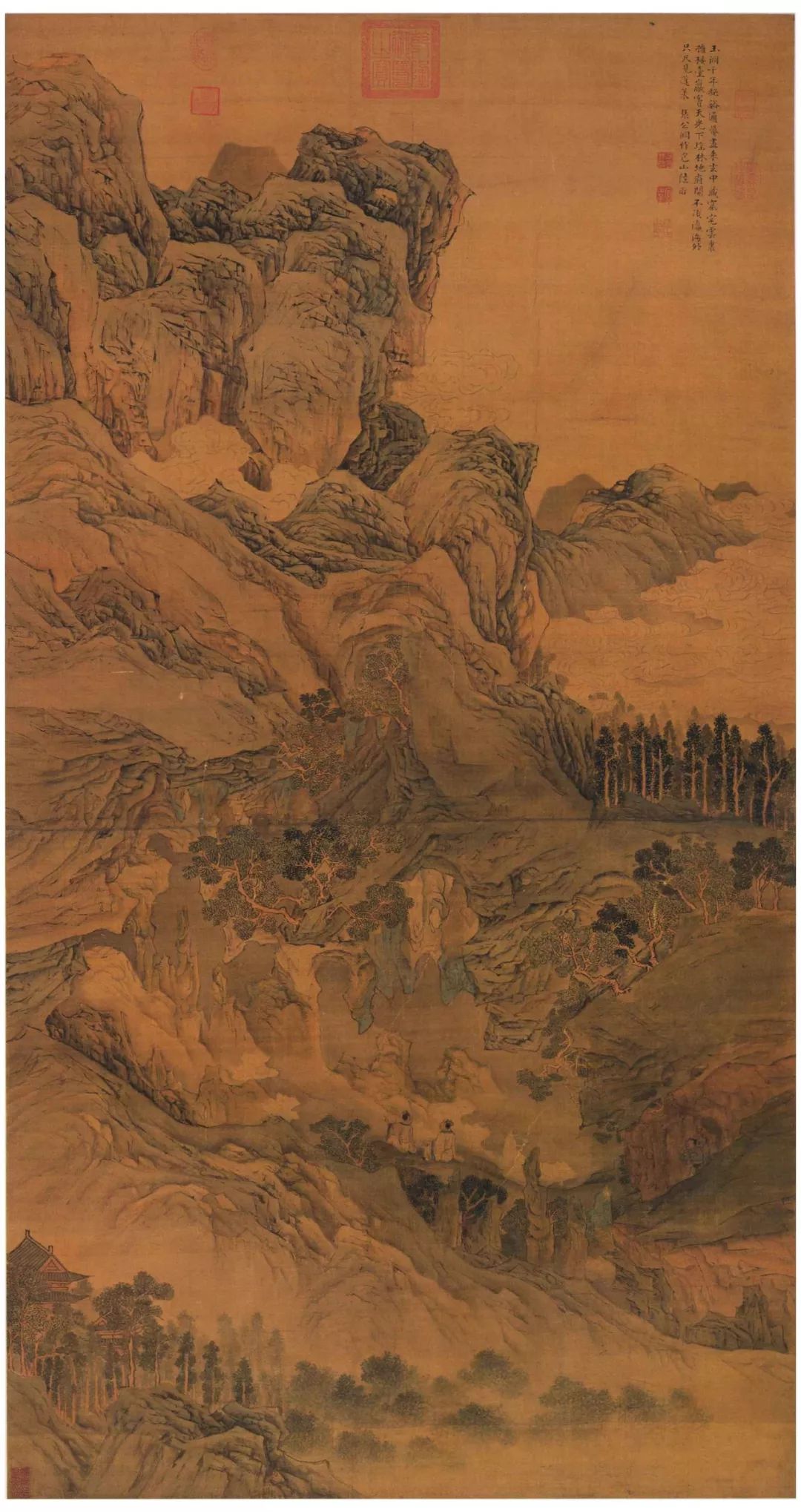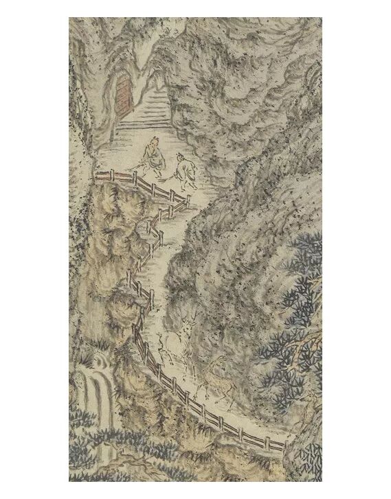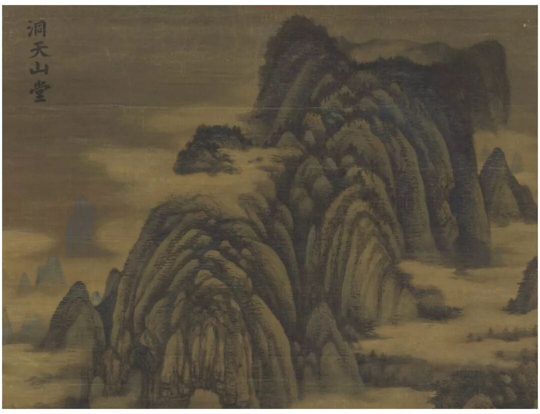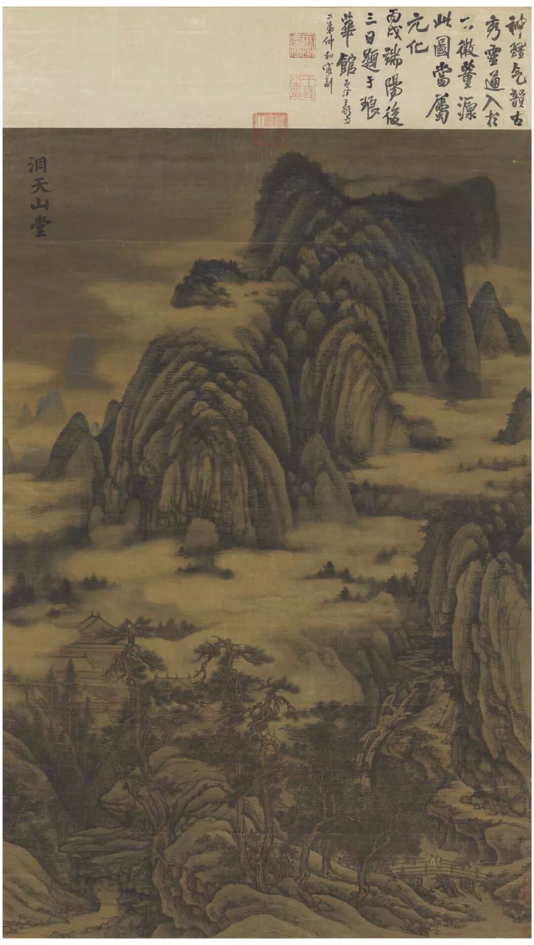 前景桥上立三人,二人头戴幞头,皆為迎客而来。中景画殿宇高耸,其上云雾弥漫,云岚与青绿色峻岭交界处,可见大小不一的洞口。洞口透着自然光,颇符合道教将名山洞穴视为仙宫灵府,内有日月光照的宗教概念。左上方「洞天山堂」四字,虽不知何人所书,却是贴切的名称。