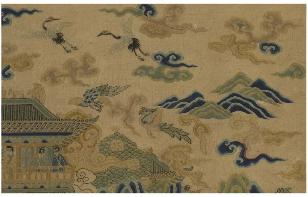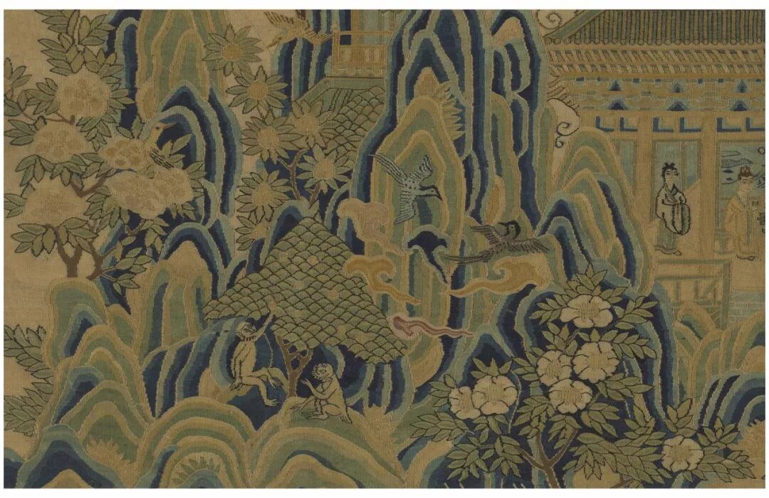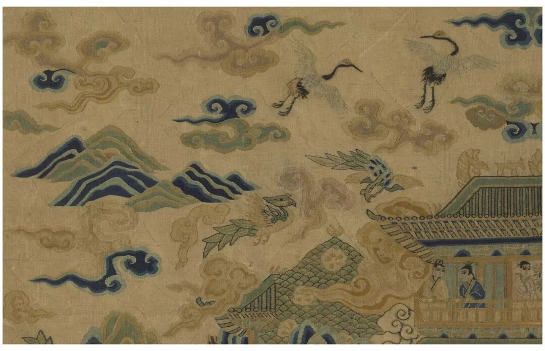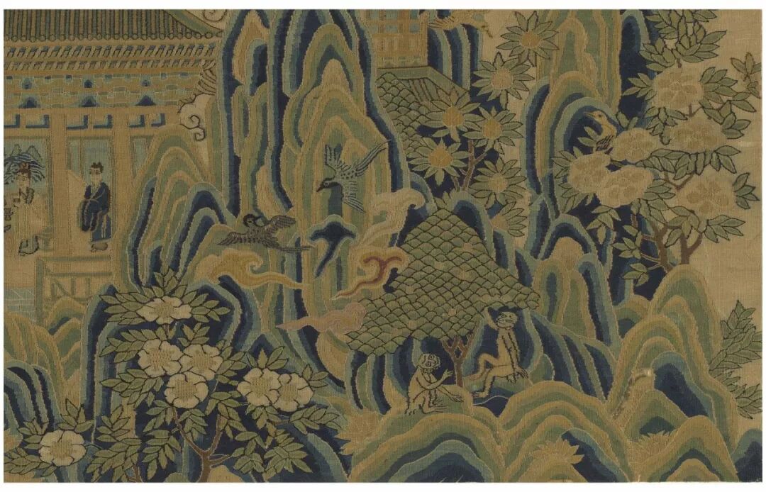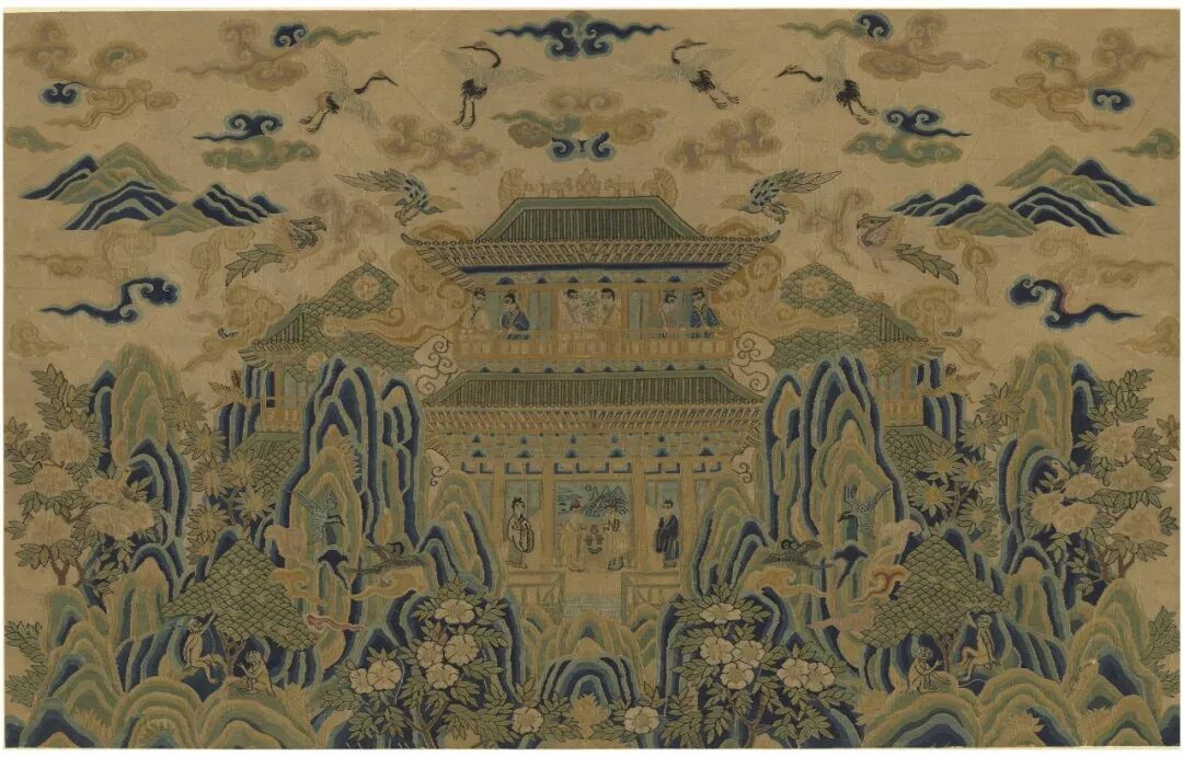 本幅布局左右对称而不失变化,前景作山石层叠,奇花异果茂盛,群猴採果,禽鸟翱翔。居中楼台殿阁矗立,人物对饮于一楼屏风前,二楼人物两两成组,凭栏观景。屋宇上方白鹤、凤凰飞舞。各式云彩飘忽涌出,营造出遗世独立的仙境。