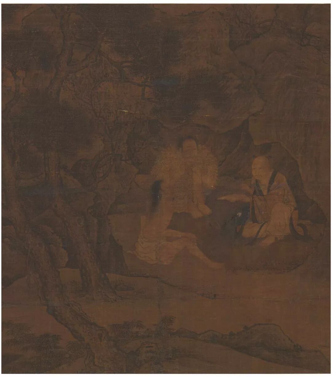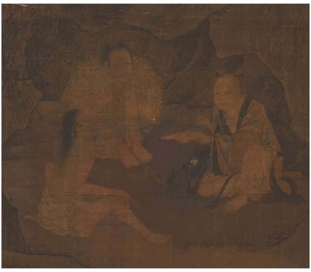 松下岩洞内,三人赤足踞坐。右方人物扎双髻、蓄鬍,肤色却如童顏般润泽,手持素卷。居中人物身著树叶,表情肃穆,右手持笔,地上放置砚台。左方人物神色庄严,披髮赤膊。内容反映出道教洞天观念下,修真学道者因特殊机缘,得以进入洞穴获致道法、经诀。右方人物应为修道之士,遇仙传授成仙秘诀的天书。