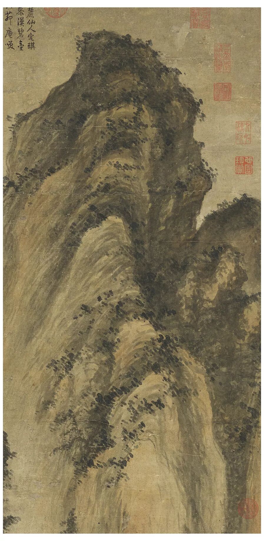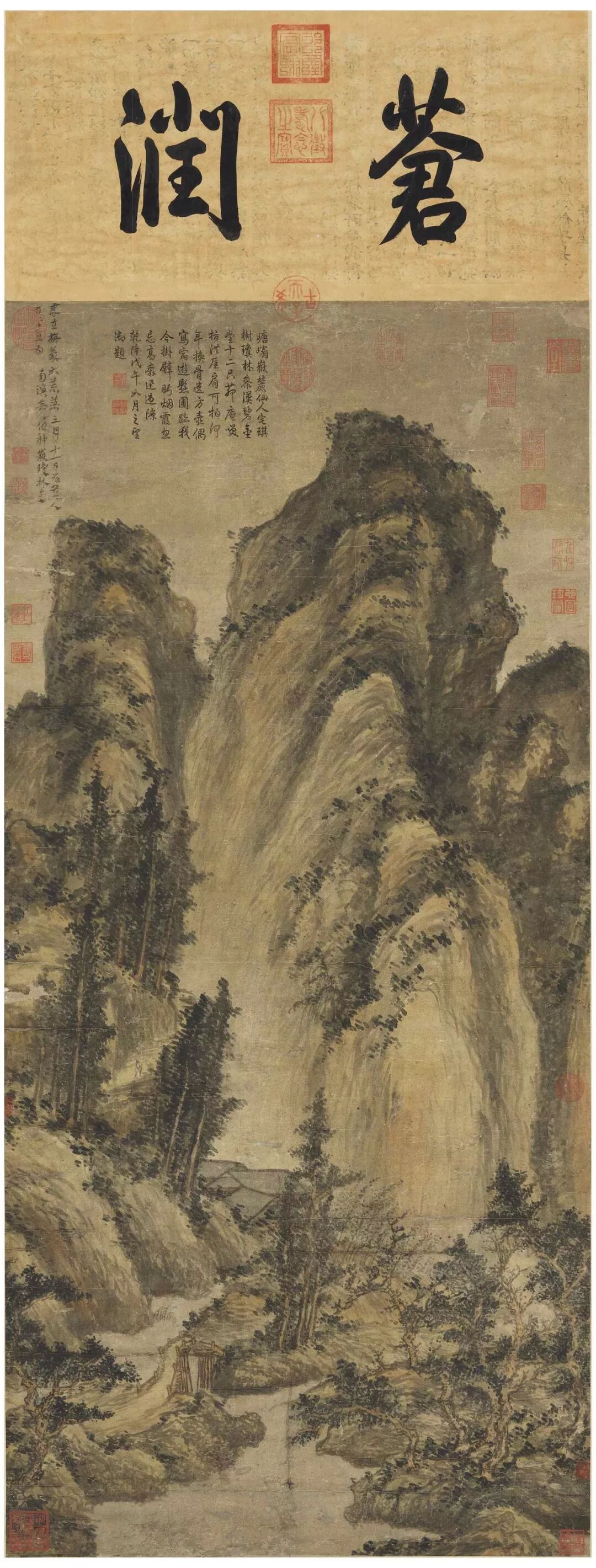 本幅无款,诗塘王铎(1592-1653)题跋将作者定为五代董源(活动于10世纪上半)。董源为江南钟陵(今江西南昌)人,善以披麻皴写江南山水,树立重要山水画派。此幅虽具董源风格,但应完成于元代。