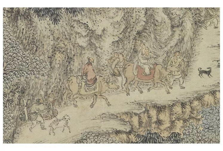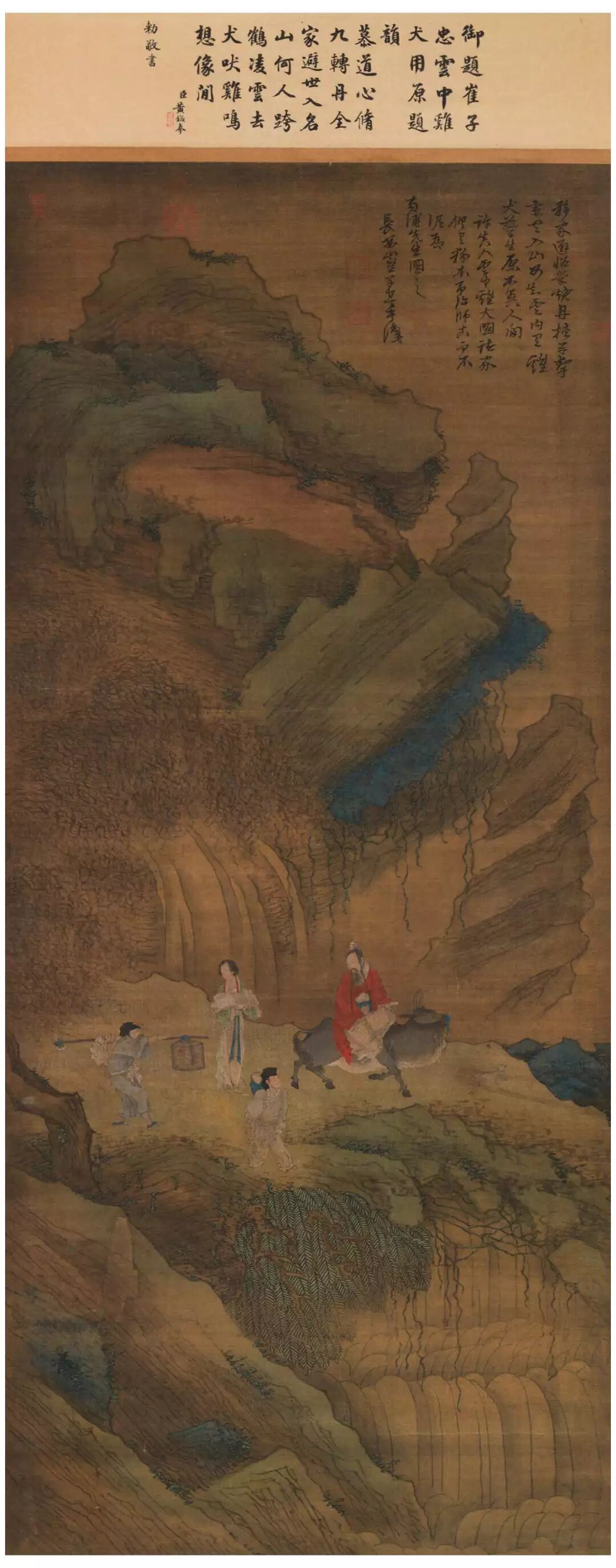 郑重(17世纪前期)此作用笔绵密,佈局窄长。前景画葛洪与妻子鲍姑骑牛前进,旁有童僕捧鹅背瓢,羊犬随行。曲折的山径,越过层叠山峦,通向道观和乐世界,表现出画中人对仙道的追求。