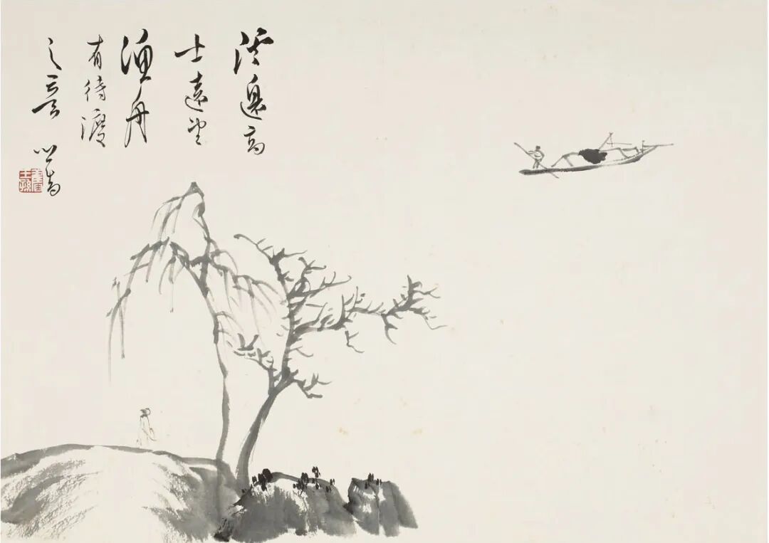 (五)溪边高士,远望渔舟,有待渡之意。心畬。