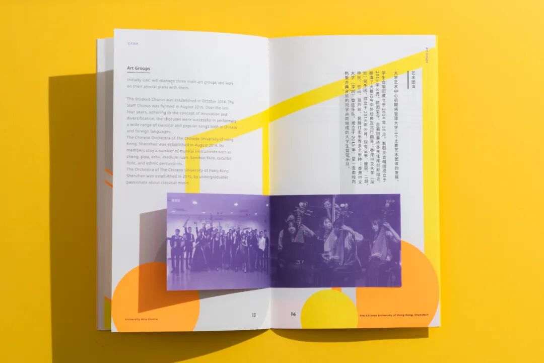 香港中文大学(深圳)大学艺术中心,致力于拉近学生与文化艺术之间的距离,使文化艺术成为学生生活的一部分。封面为大学艺术中心的图形概括,以孵化器、对话筒的不同朝向来诠释艺术中心的多元化。内页以抽象图形轻松解读各种艺术活动分类。
