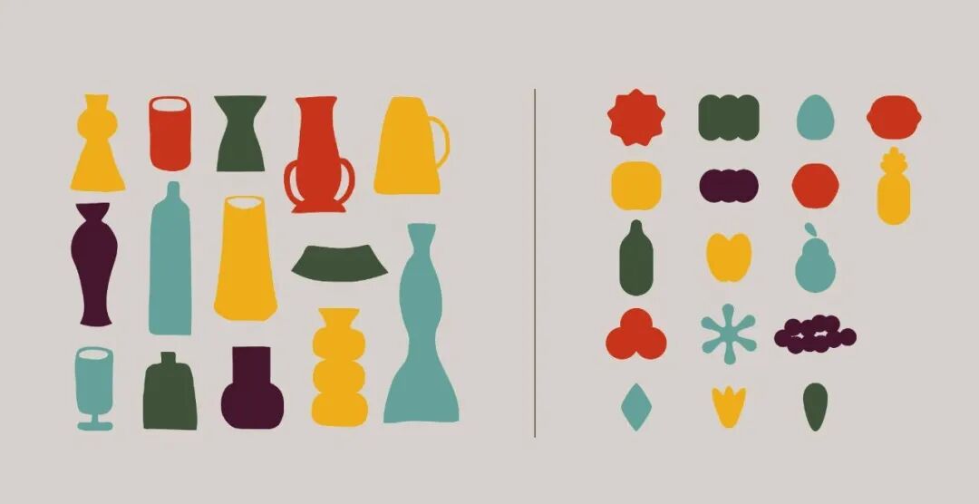 设计师分别以水果、花卉和容器三种元素为主体,以不同的组合排列各种静物。其中,水果和花卉以规则几何形的表现形式呈现,容器则以具象的形态呈现,组合在一起共同呈现静物之美。
