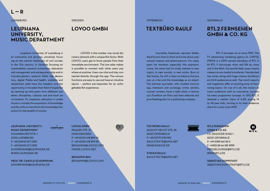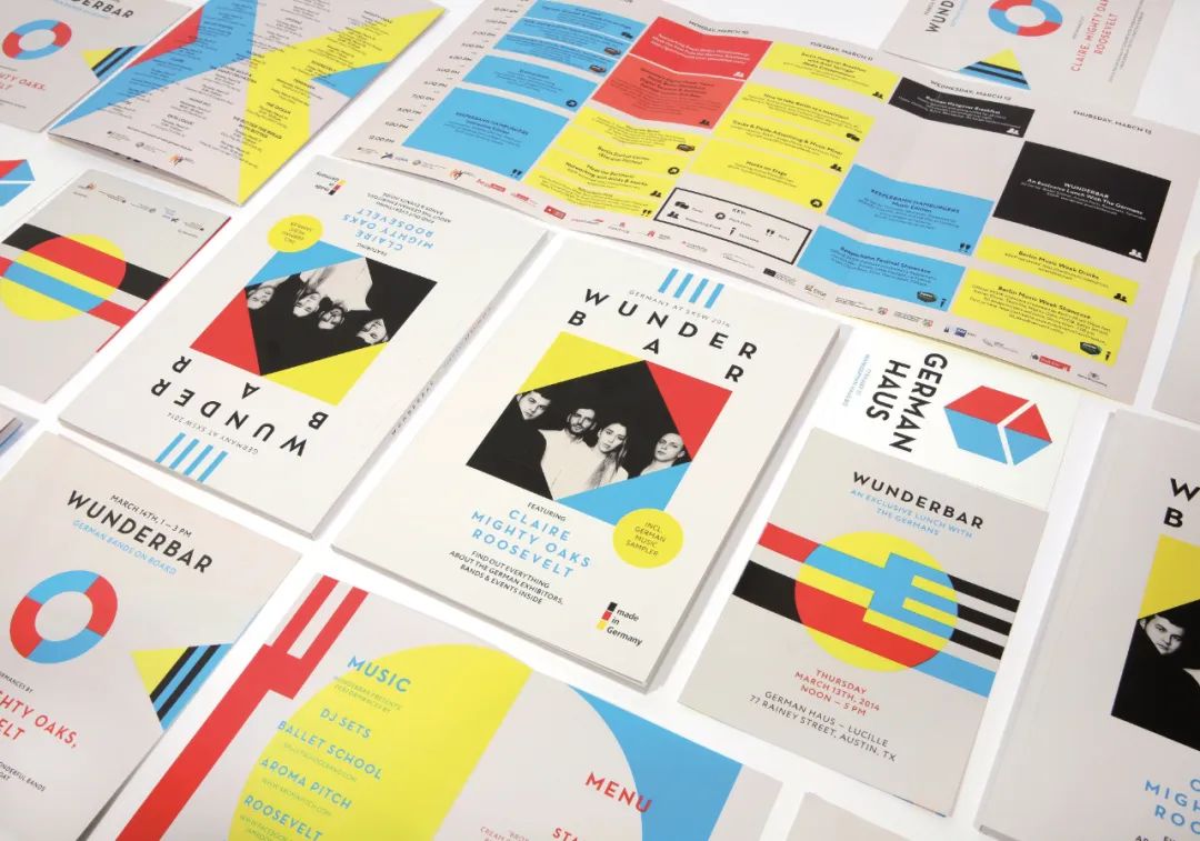 Rocket & Wink为German Haus设计了一套新的企业形象。设计受到了包豪斯风格的影响,包豪斯风格不仅体现在Wunderbar小册子上,还应用到了横幅、传单、菜单、广告、海报和乐队演出的时间表上。