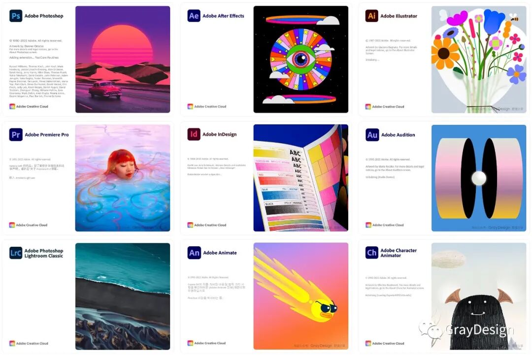 今天,GrayDesign想和大家分享的是最新的Adobe 2023版软件的启动页面,与去年发布的Adobe 2022版软件启动页面相比,今年的软件启动页整体风格变得更加简洁了。