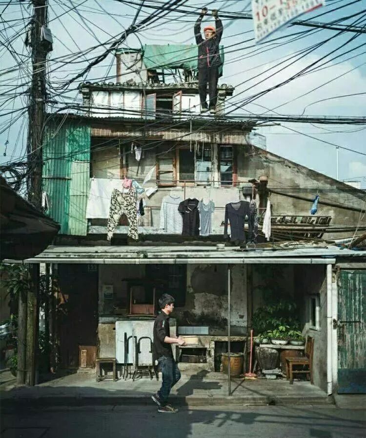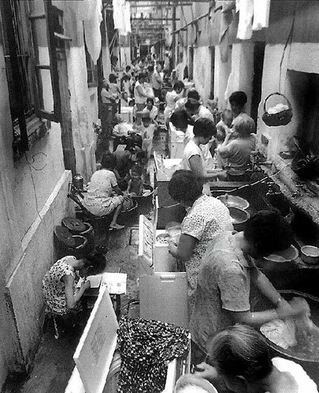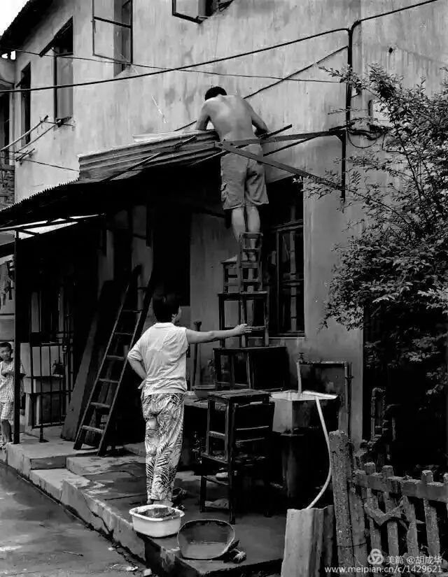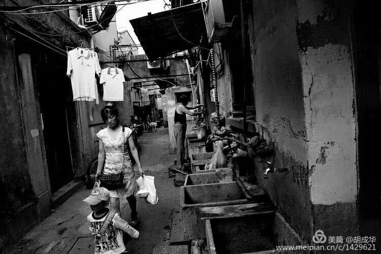 许多老弄堂的家庭里没有水龙头,所以洗刷的水斗一字排列在弄堂居室的一侧,也形成了老弄堂特有风景。