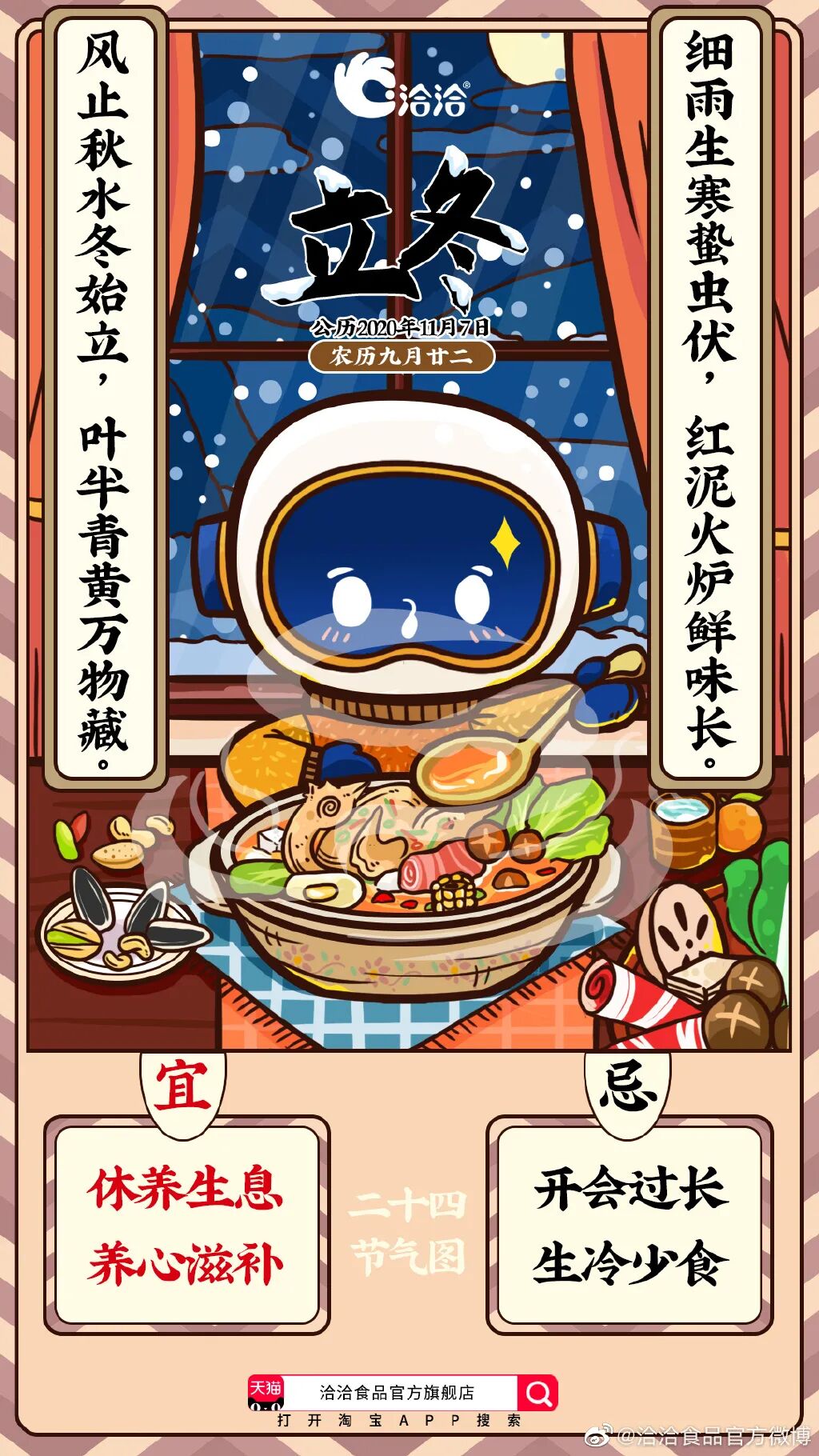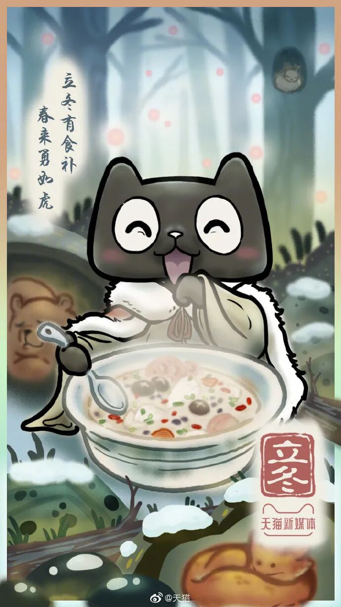 #天猫24节气图#之今日#立冬# ,二十四节气中的第19个节气,冬季的第一个节气。立,建始也,冬季自此开始;冬,终也,万物收藏也,草木凋零,蛰虫休眠,人们虽不会冬眠,但却会“立冬补冬,补嘴空”。