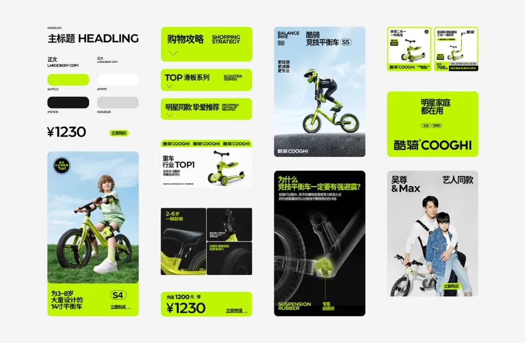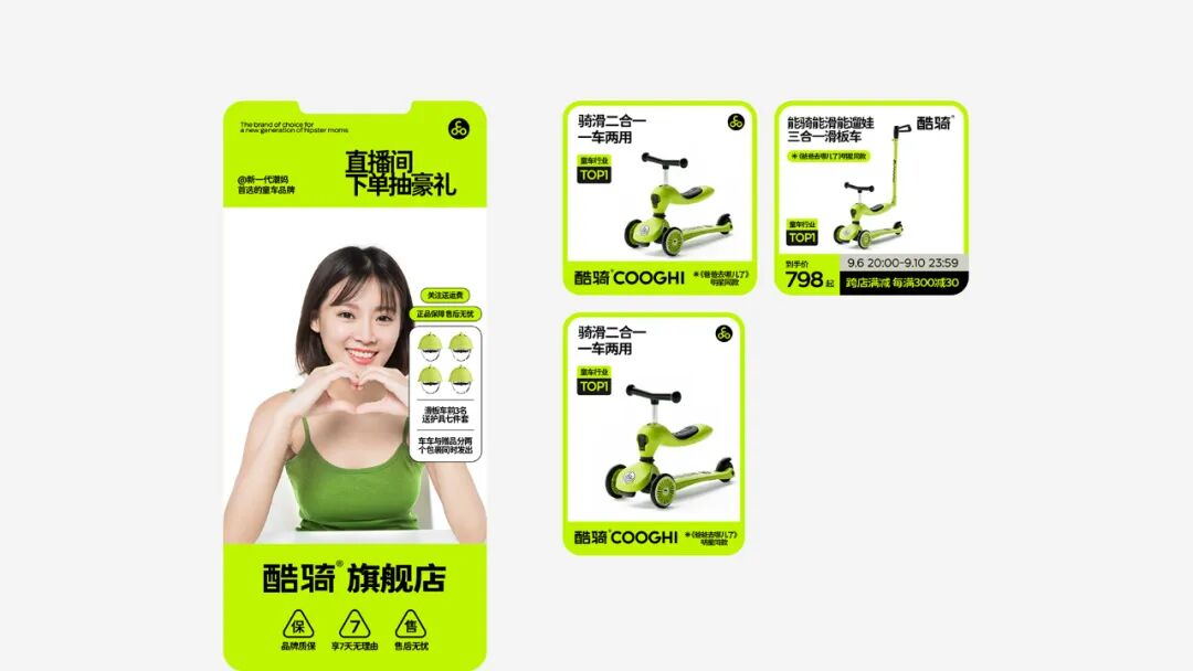 COOGHI酷骑是中国童车行业领军品牌,旗下滑板车、儿童平衡车等热门品类长期占据天猫、京东热销榜第一,立志成为全球2000万高端家庭的首选童车品牌。由国内品牌设计机构「巴顿」为其定制新的品牌定位——“新一代潮妈首选的童车品牌”,从logo、包装、VI系统到线下终端空间设计,为酷骑进行全面的品牌升级。以年轻、潮酷为理念实现三大升级目标: