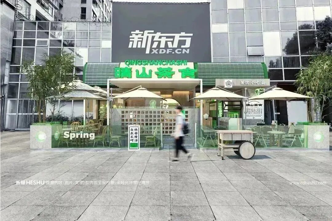 很大的露天外摆是这次茶食店很大的一个优势,也是我们展示性和体验感最好的一个区域。我们以亭和庭为概念。