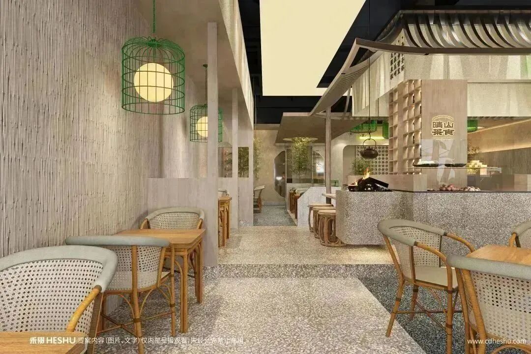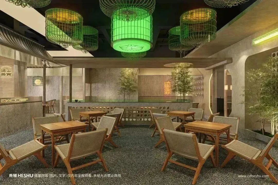 顶面用大型的鸟笼装置唤醒消费者对传统茶馆院落的印象。四周用竹子来围合空间以打造出一种竹林饮茶的消费场景。