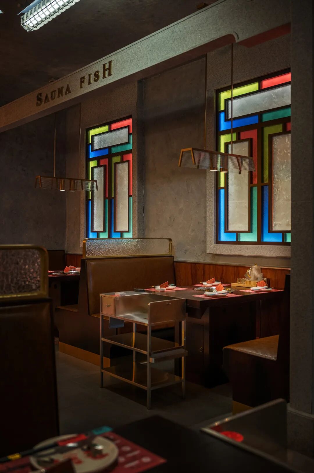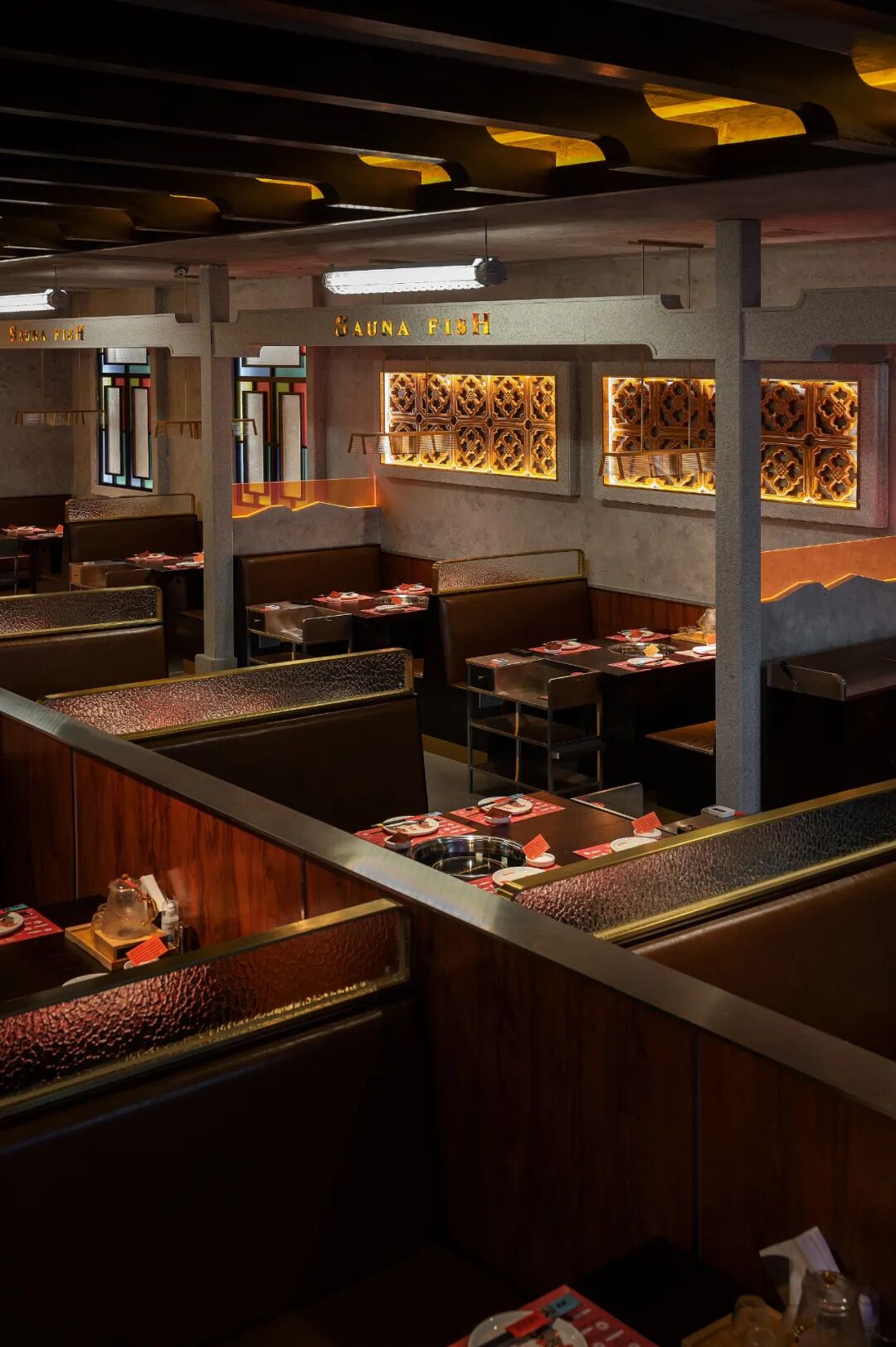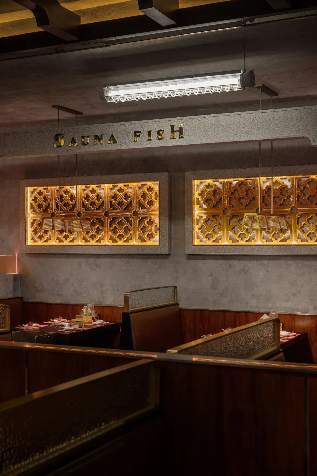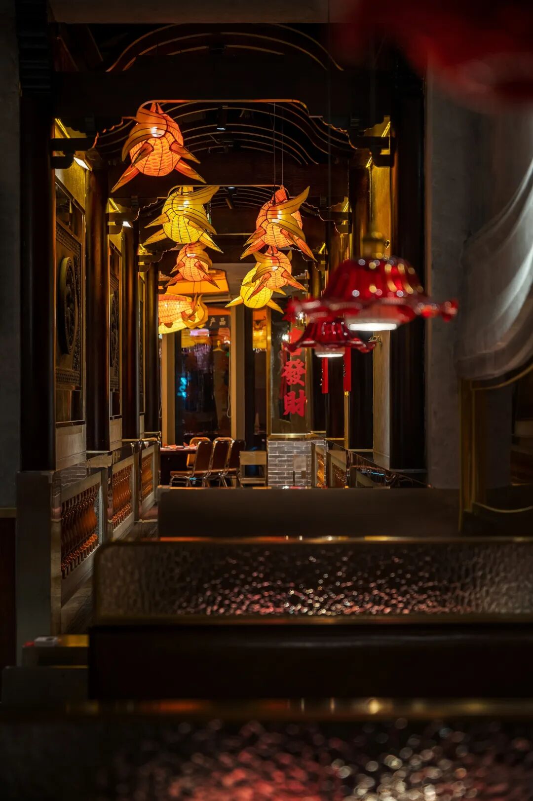 一个长接近十米宽度不到两米的灰度空间,设计的时候在结构上参考顺德廊桥,墙面的的锈镜视觉上增加廊桥的宽度,墙面上大洗发光logo和石板雕刻的鱼图案突出品牌和品类。顶上的鱼灯笼都是朝大厅游去,让消费者觉得后面还有个惊喜的空间。