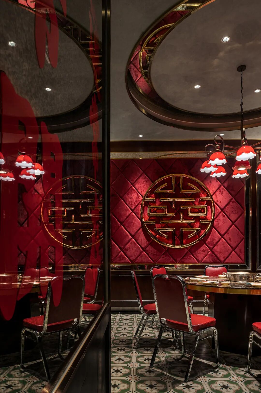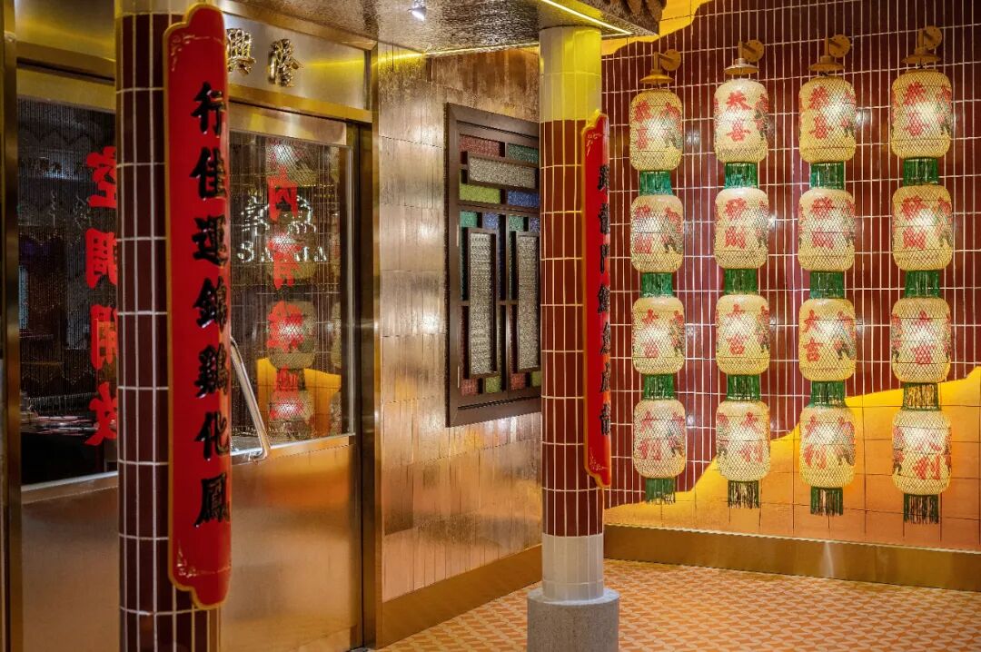 入口的双色水晶挂帘一下把消费者的感受带入老广文化里,随后墙面上的镬耳屋轮廓造型用不锈钢与传统材料结合,形成鲜明的视觉冲突。