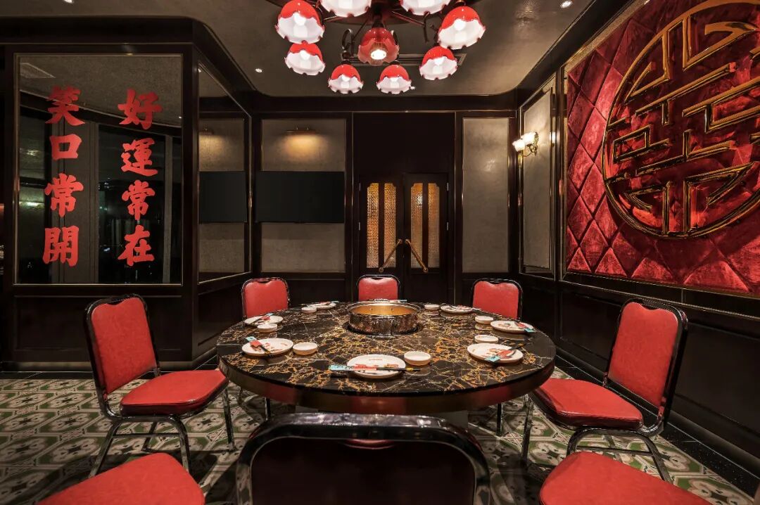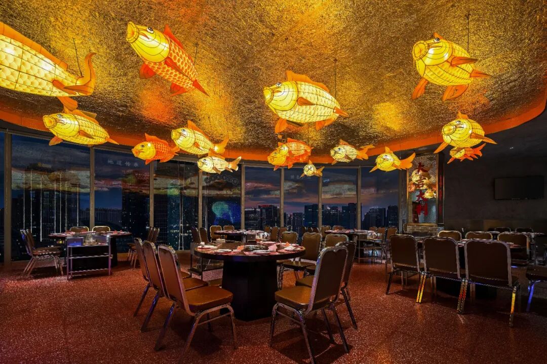 顺着狭长的廊桥下来,首先能够感受到视觉的开阔和身体自由度的放松。用复古红色水磨石把大厅的空间尺度感和层次感表现出来。开阔的现代落地玻璃给了场地很好的自然条件,顶面吊的鱼灯波光粼粼的锡箔纸犹如鱼在水里游动的感觉,让空间有一些生机。