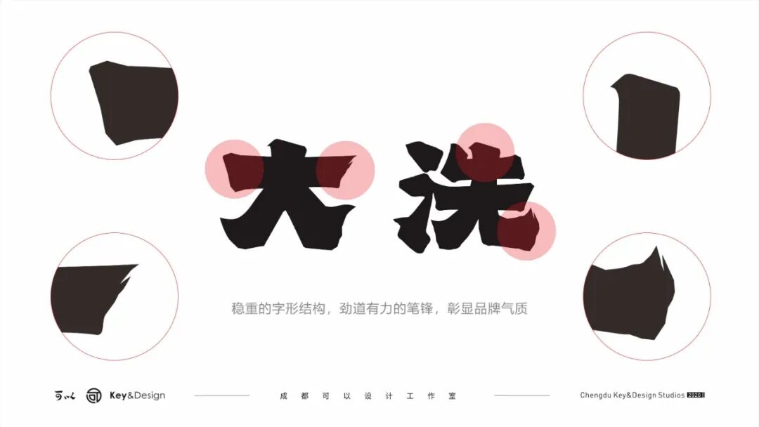 品牌的气质及特色的产品都表现出厚重的文化味,所以我们在"大洗"LOGO字体设计上,选用传统榜书为基底。但是要与品牌气质更加匹配,所以我们需要字体设计具备大气、力道、厚重。