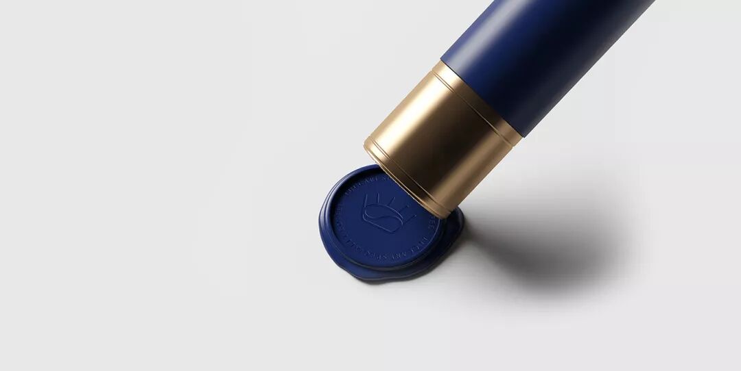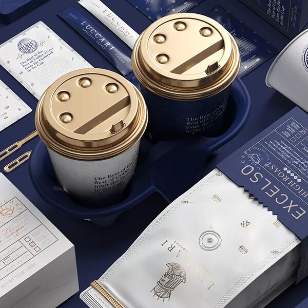 使用深蓝色与金色搭配,在附属产品使用金色极为突出,视觉上具有奢侈品的质感。