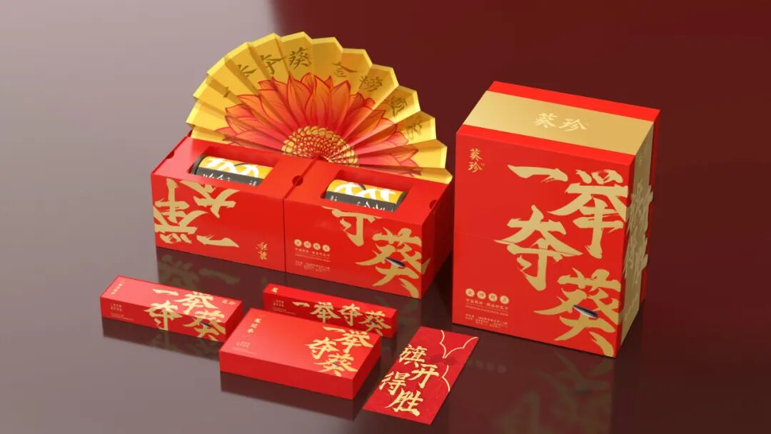 3、在整体设计上,葵珍还运用了一些巧思,礼盒采用书本式结构,朝两侧打开时,衔接在中间的葵花折扇就会随之打开,呈现“一举夺葵,金榜题名”的字眼,不仅极具创意感和惊喜感,也将原本充满美好寓意的礼盒推上新的高度。