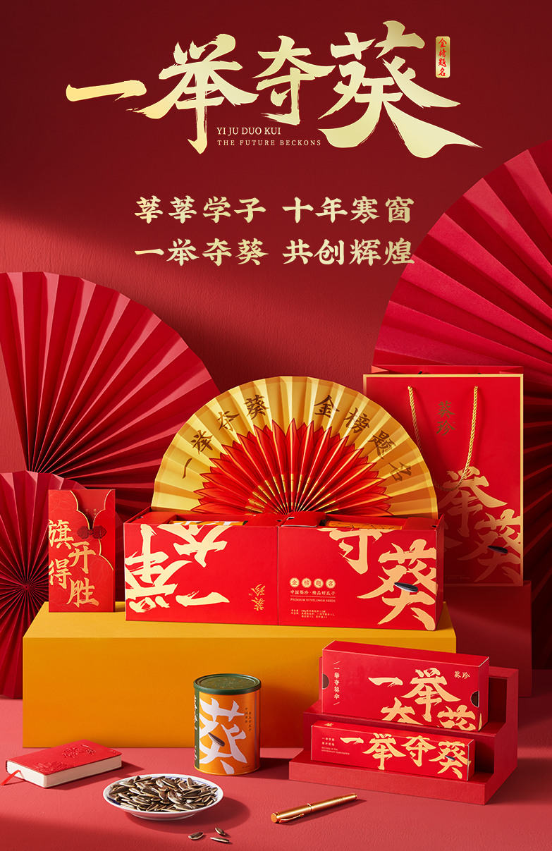 为了给考生们加油打气,葵珍将借势高考营销的这一出发点落到实处而非营销表面,推出“一举夺葵”礼盒,内含葵珍精选的瓜子产品,以及笔记本、伞、签字笔、旗开得胜贺卡等具有实用性的周边产品。