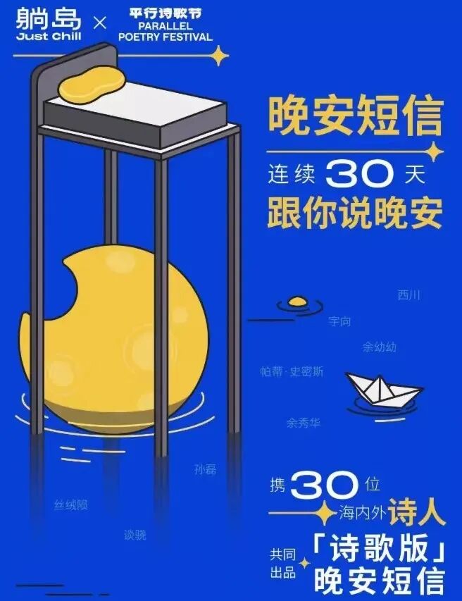 11月24日,睡眠环境品牌「躺岛」联合「平行诗歌节」,共同推出第6季晚安短信,邀请西川、宇向、余幼幼、孙磊、余秀华、帕蒂·史密斯等30位海内外诗人、作家、策展人等,用诗歌和消费者说晚安。