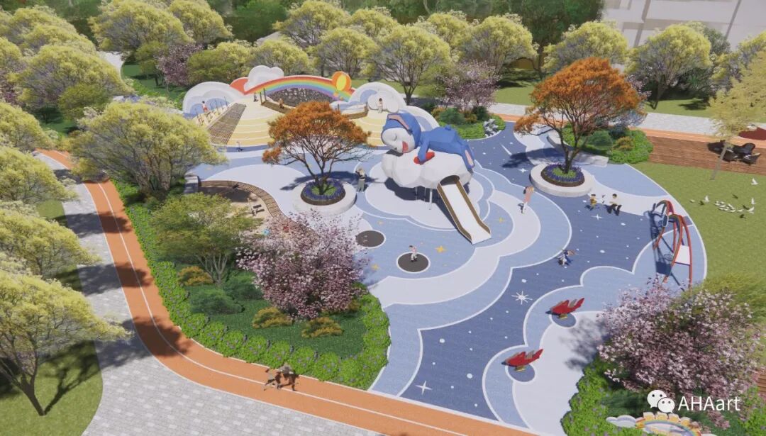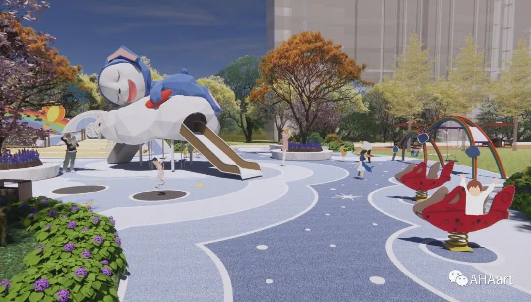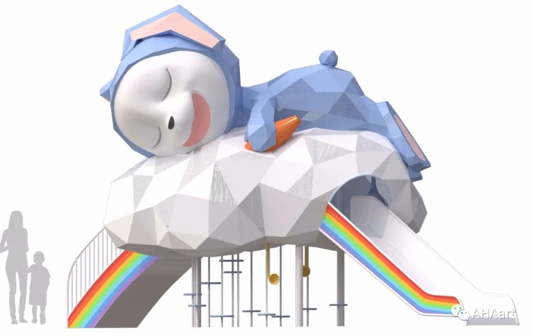 「梦幻云谷」主题器械,以皮皮兔在彩虹云上熟睡的造型与孩子们达成同频,得到孩子们的喜爱。器械加载多样化的游玩路线,锻炼孩子们的身体素质,促进孩子们在玩乐中沟通交流,在场地空间中得到寓教于乐的全面成长。