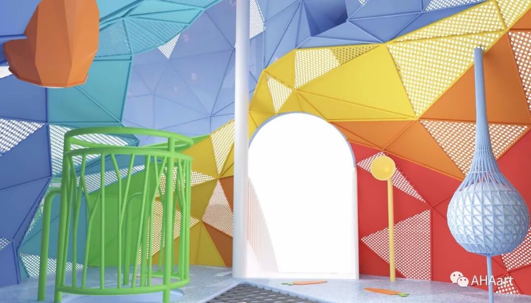 我们在器械内部设计了胡萝卜灯、胡萝卜叶护栏、头顶的幻彩亚克力,所到之处都是兔子的最爱。还有一个巨大的瑜伽吊球装置,督促皮皮兔要记得运动。
