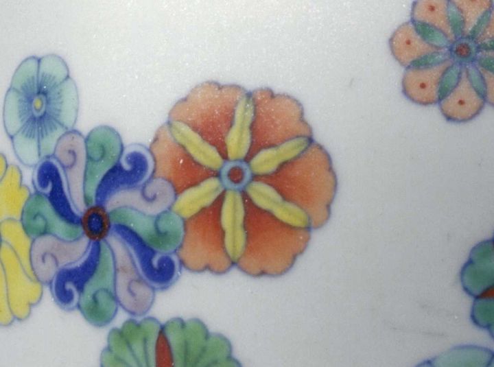 因为每一个色块,都是先要以青花勾线,所有的颜色都在青花的约束之下,相互之间,不直接起冲突,而青花的颜色本身又能够将他们协调在一起。