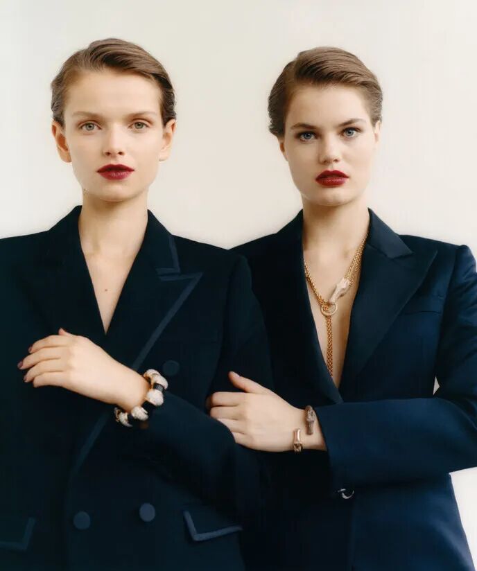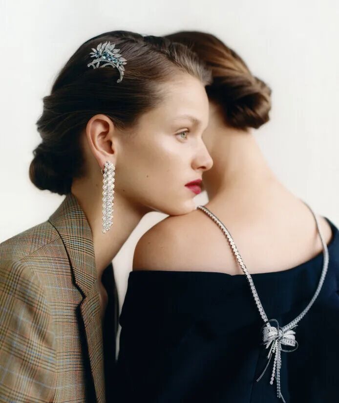 而在Wall Street Journal的系列中,Jens Ingvarsson通过对人物的洞察力展示了女性力量之美。笔挺的西装与闪闪发光的珠宝形成了亦刚亦柔的对比,酒红色的丝绒花朵又为女性增添一丝柔美。