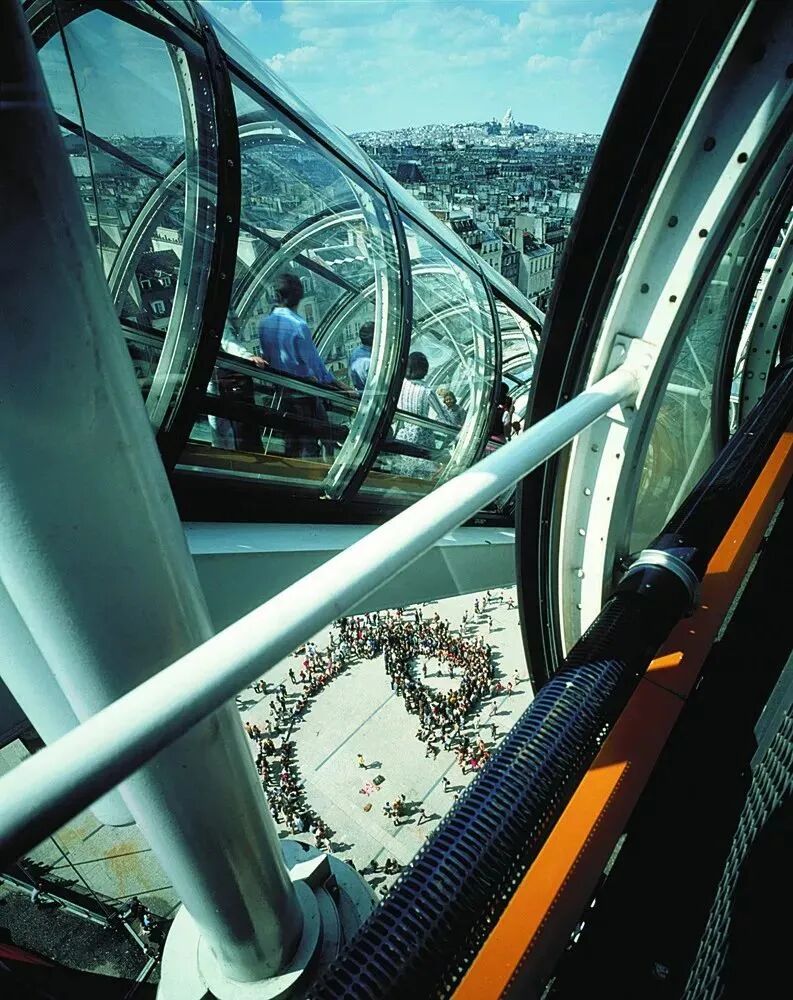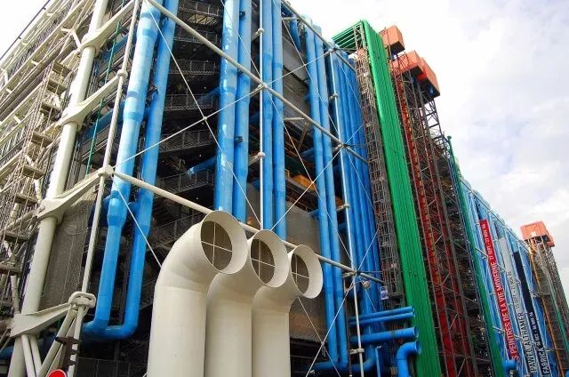 一是,在当时整个巴黎建筑都崇尚历史文脉,细节精致的潮流中,他们反其道,将大部分的结构都裸露在外。电梯、扶梯、管道等,这些既是建筑的结构,也成为了装饰的部分。