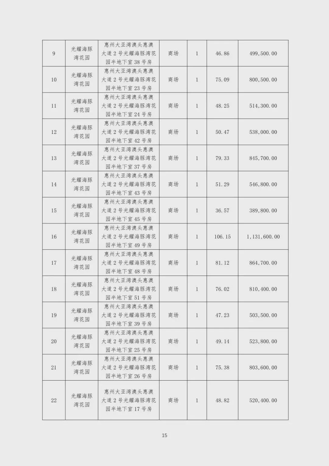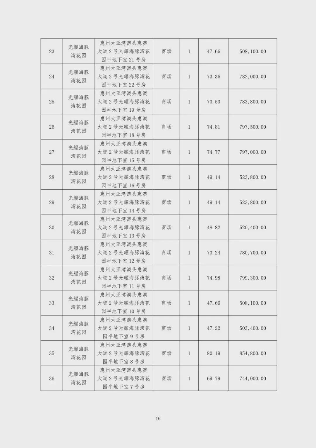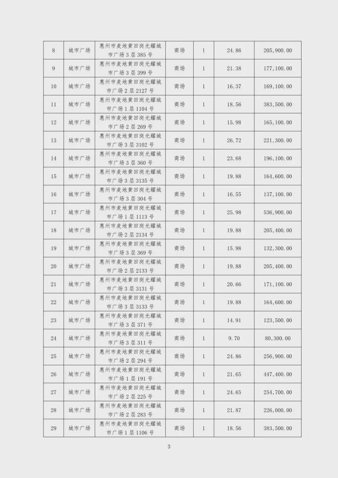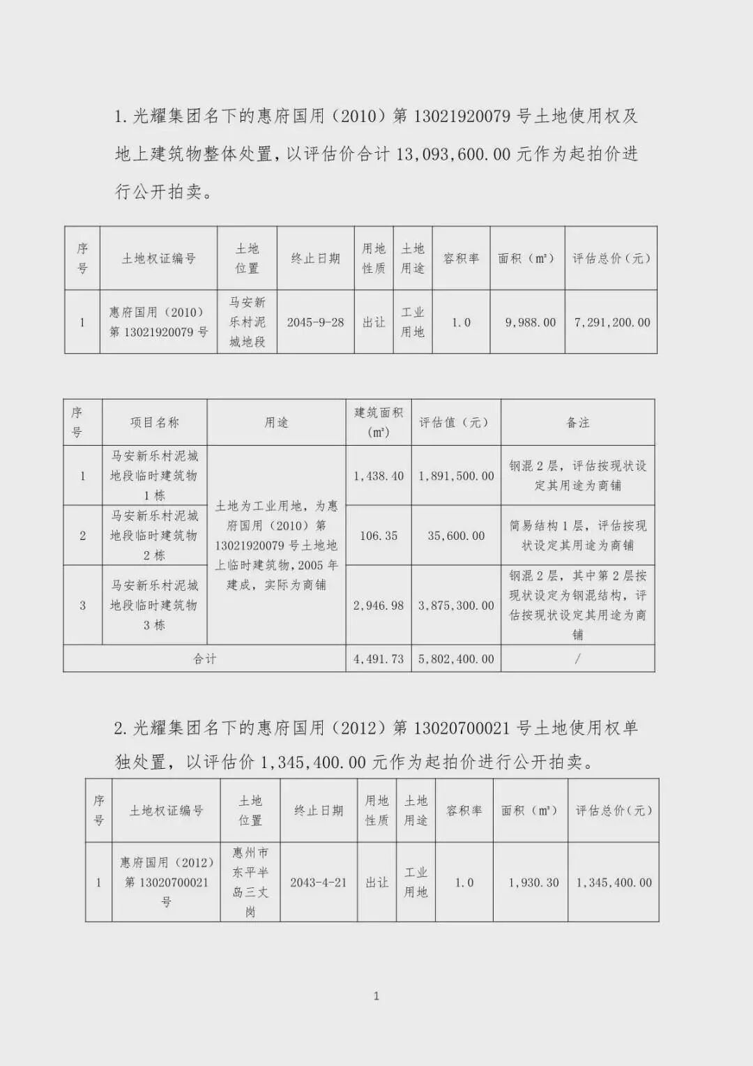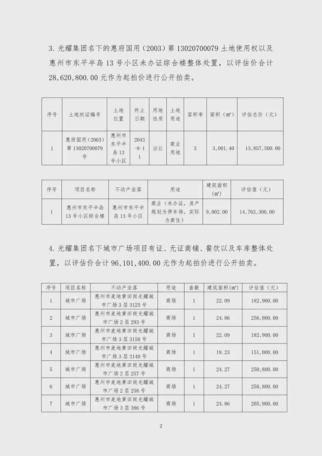3.光耀集团名下的惠府国用(2003)第13020700079号土地使用权以及惠州市东平半岛13号小区未办证综合楼整体处置,以评估价合计28,620,800.00元作为起拍价进行公开拍卖。