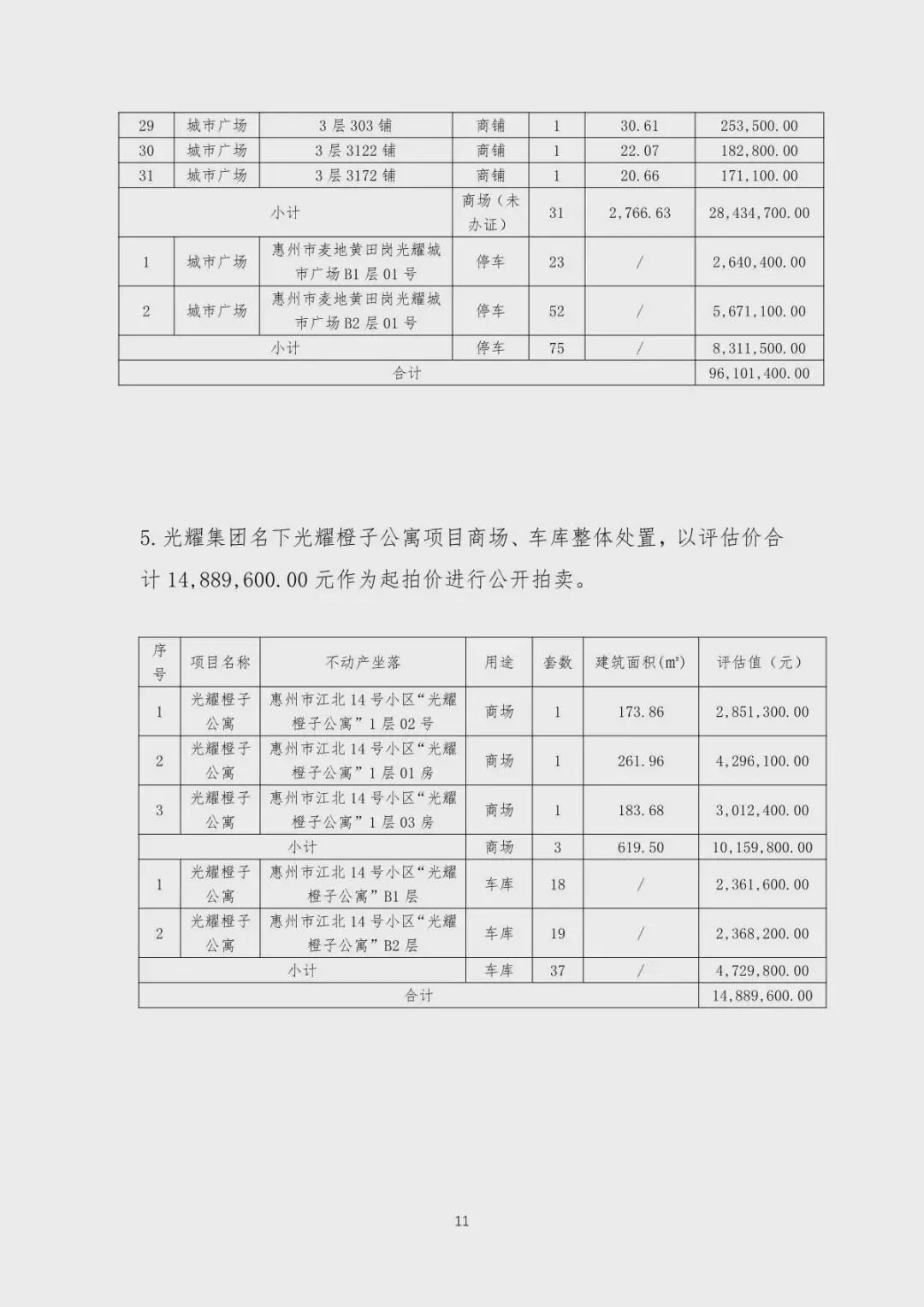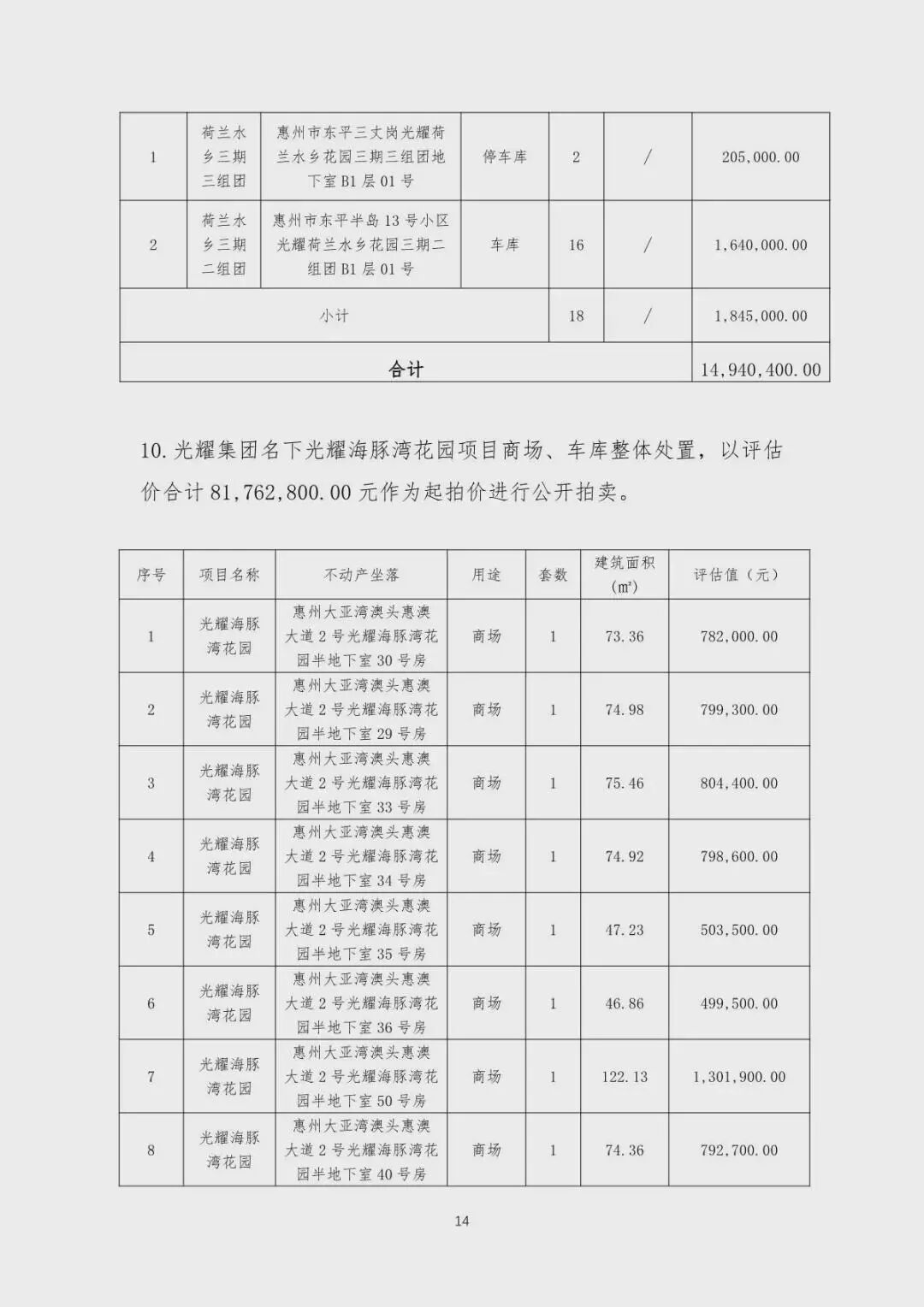 10.光耀集团名下光耀海豚湾花园项目商场、车库整体处置,以评估价合计81,762,800.00元作为起拍价进行公开拍卖。