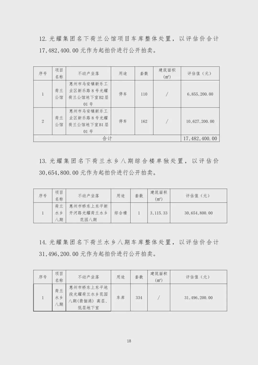 12.光耀集团名下荷兰公馆项目车库整体处置,以评估价合计17,482,400.00元作为起拍价进行公开拍卖。