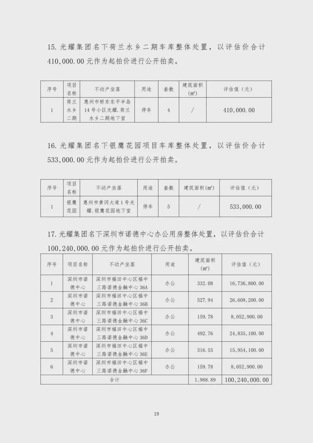 17.光耀集团名下深圳市诺德中心办公用房整体处置,以评估价合计100,240,000.00元作为起拍价进行公开拍卖。