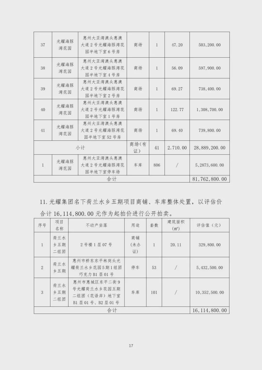 11.光耀集团名下荷兰水乡五期项目商铺、车库整体处置,以评估价合计16,114,800.00元作为起拍价进行公开拍卖。