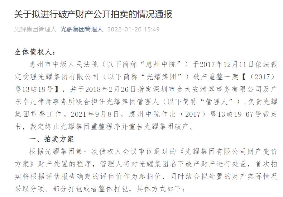 1月20日,据“光耀集团管理人”微信公众号披露,根据光耀集团第一次债权人会议审议通过的《光耀集团有限公司财产变价方案》财产处置的程序,管理人将对光耀集团名下破产财产进行处置,首次拍卖将根据评估报告确定的评估价作为起拍价,同时结合拟处置的财产实际情况采取分项、部分打包或者整体打包。