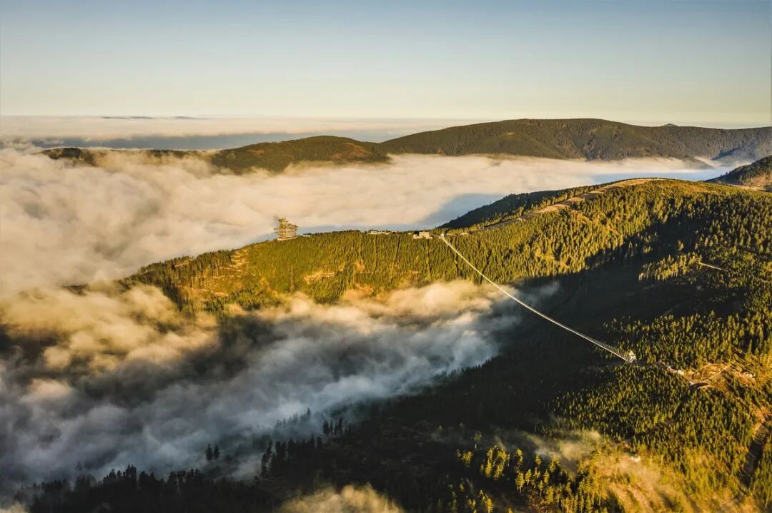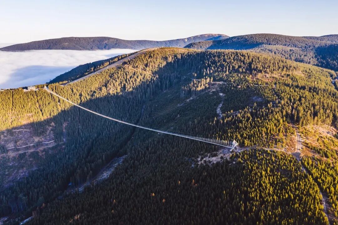 游客可以在鹰山和耶塞尼克山之间享受大自然的无尽风光,新的悬索桥就建在Dolní Morava山区。Dolni Morava是一个度假胜地,也是滑雪场、高山过山车、山顶餐厅和名为Sky Walk的景点的所在地,Sky Walk是一个带有木制人行道的弯曲结构。