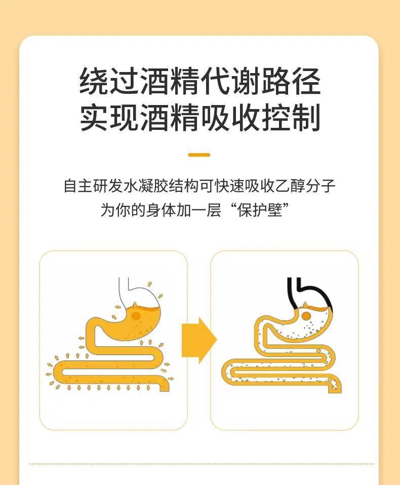 山海植物·谜毂果冻条的作用机制就是利用特殊的水凝胶结构,在整个消化道直接吸收乙醇分子,牢牢将其锁住,且因为膳食纤维在人体内不会被降解吸收,从而达到降低胃内/小肠酒精含量,缓解醉酒和减轻肝脏负担。
