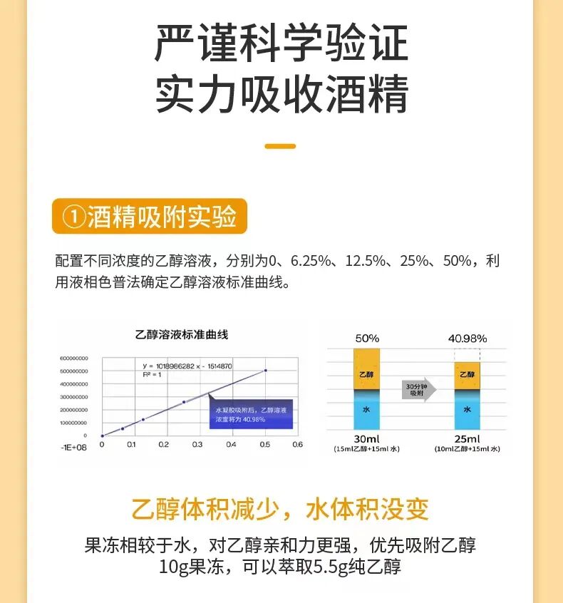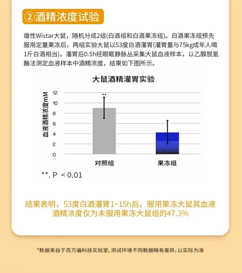 动物实验验证:在雄性Wistar大鼠53度白酒灌胃的实验里,服用果冻的大鼠血液中酒精浓度平均仅为未服用果冻大鼠组的47.3%。