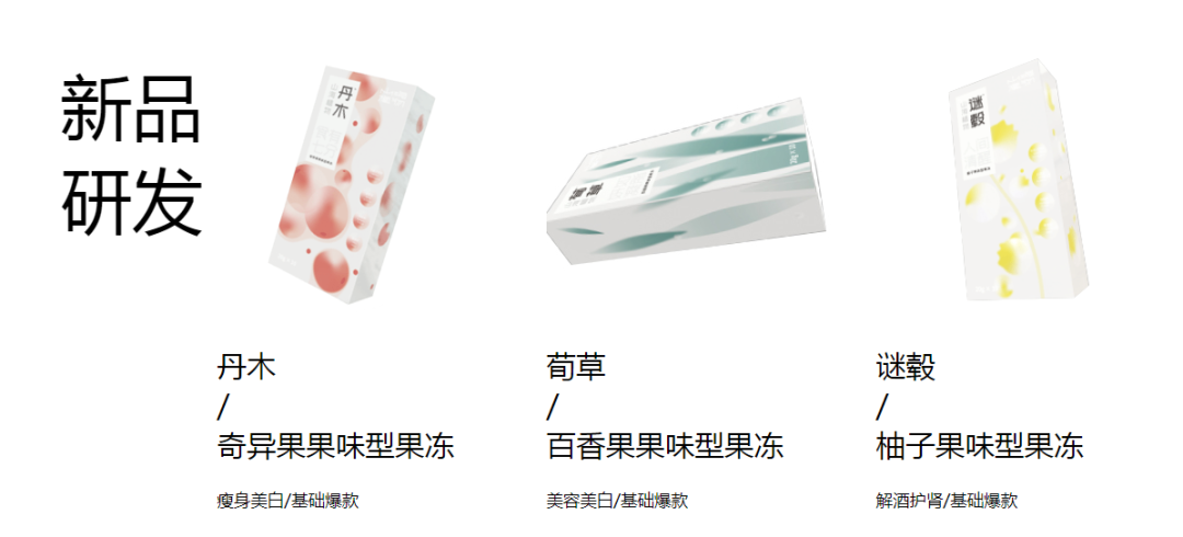 研发思路:针对比如减肥、解酒等特定问题,寻找适合食品添加方式的成分原料或配方,再确定果冻、软糖、饮料等不同产品形态、核心成分浓度以及其他配料,首条产品线的三款果冻产品研发周期在半年左右。