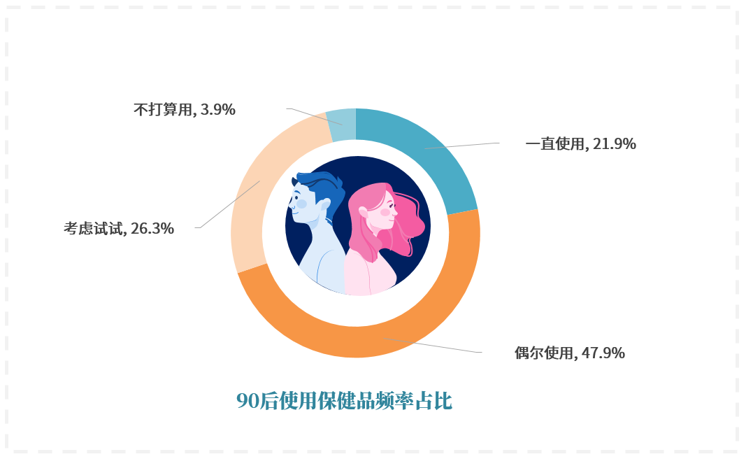 据速途研究院发布的《“90后”养生报告》显示,国内长时间使用保健品的“90后”占比21.9%,有接近一半的“90后”偶尔会使用保健品,而排斥保健品的“90后”群体只占3.9%。