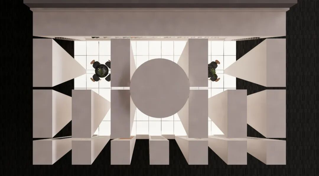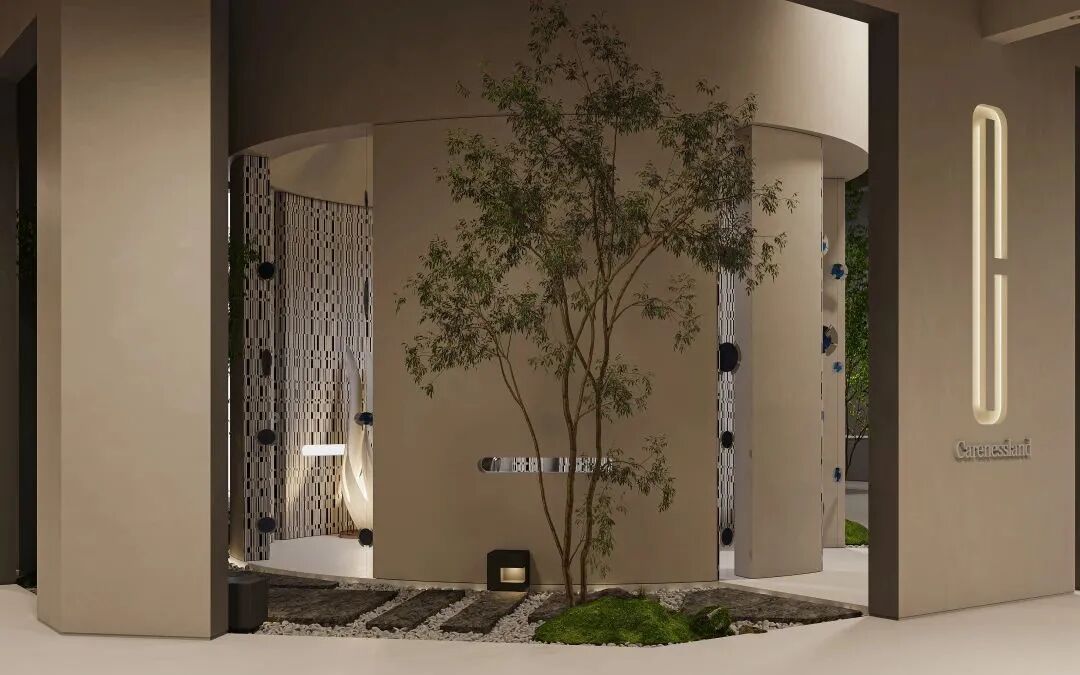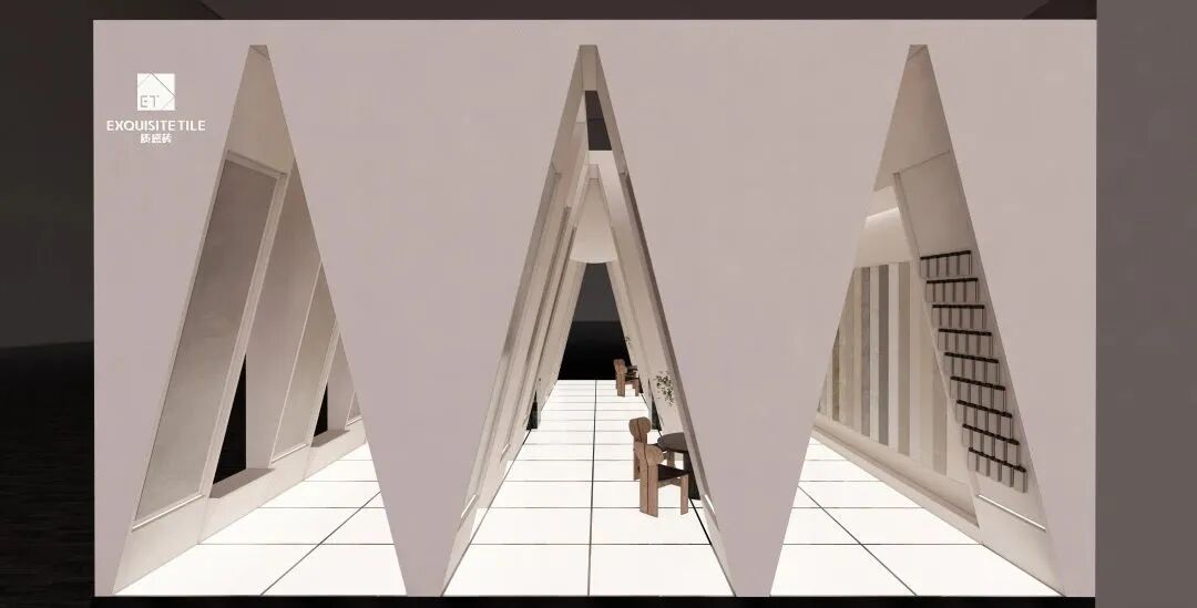李明帅先生:“负空间”是本次展览项目的关键词,挖掘出的负空间山形走廊如画廊,产品镶嵌在墙壁边缘的负形内,是我们对瓷砖展陈方式的一次新尝试。