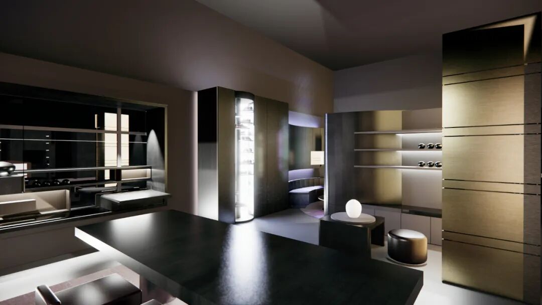 赵非女士:全新生活方式场景化的呈现,摒弃了传统奢华材质的堆砌。转向工艺技术,质感,灯光上的多方位呈现。不单单是某一个展品的呈现,而是整体场景氛围的营造。