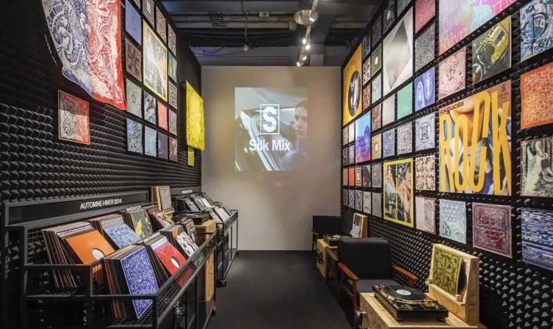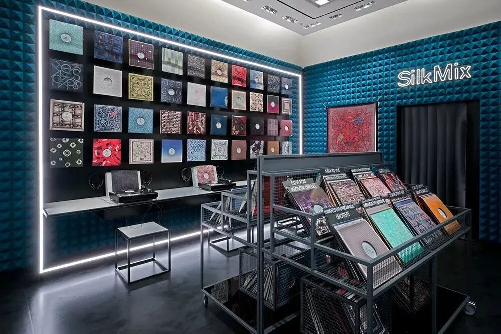 Hermès 以黑胶唱片行作为灵感,以浏览、聆听、探索三大主题出发,打造了一间丝巾唱片行,将品牌引以为傲的丝巾与音乐相结合。