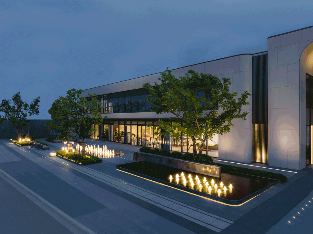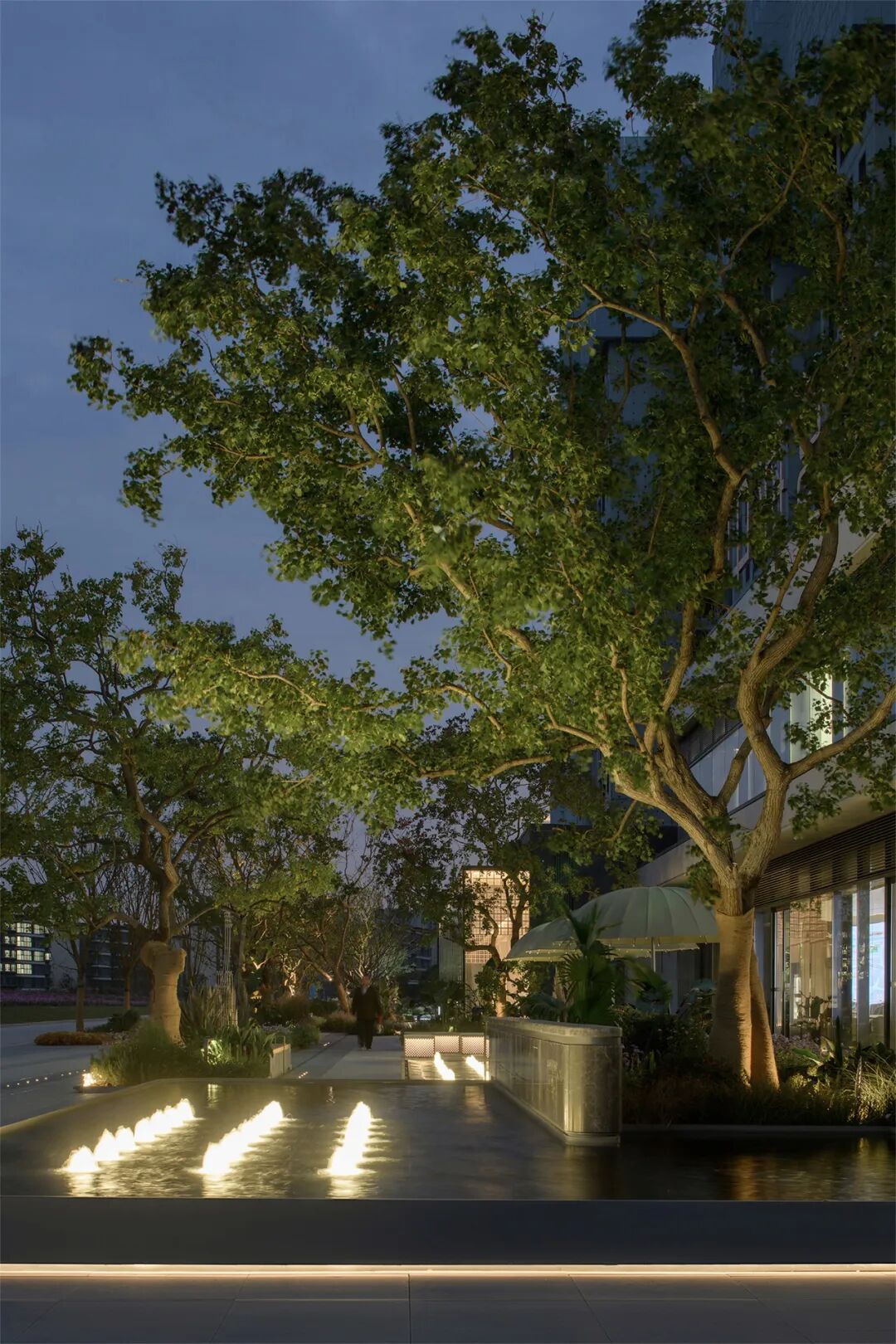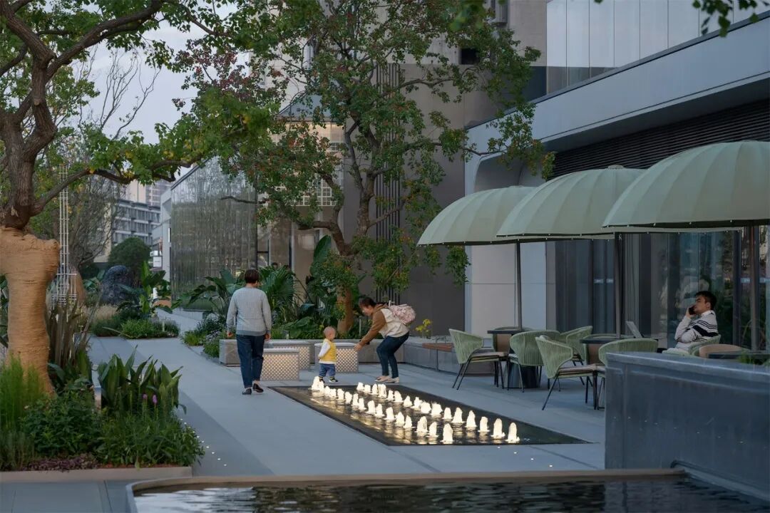 初探水景,安心宁静。水景的出现为访客带来修心养性般的静谧氛围,静水与涌泉交相辉映,诉说着动与静的辩证。建筑的倒影映于水面,空间感由此延伸。远处方山和近景的山石形相映成趣,园区景观灯采用简约的折线线框设计,在花镜中若隐若现,为场地增添品质之感。