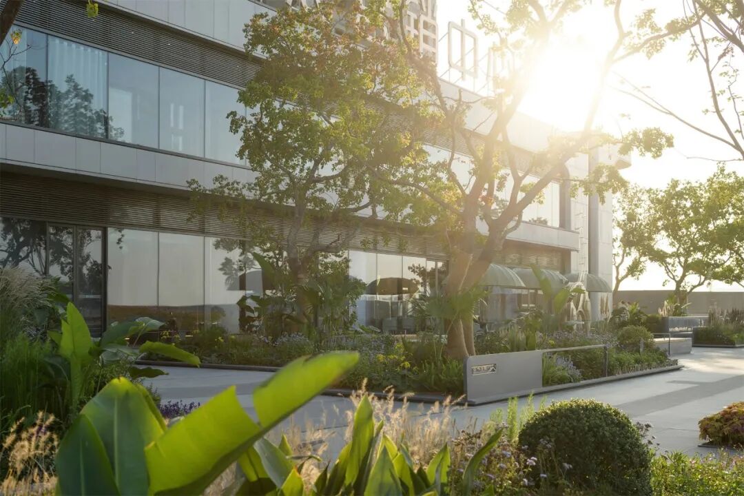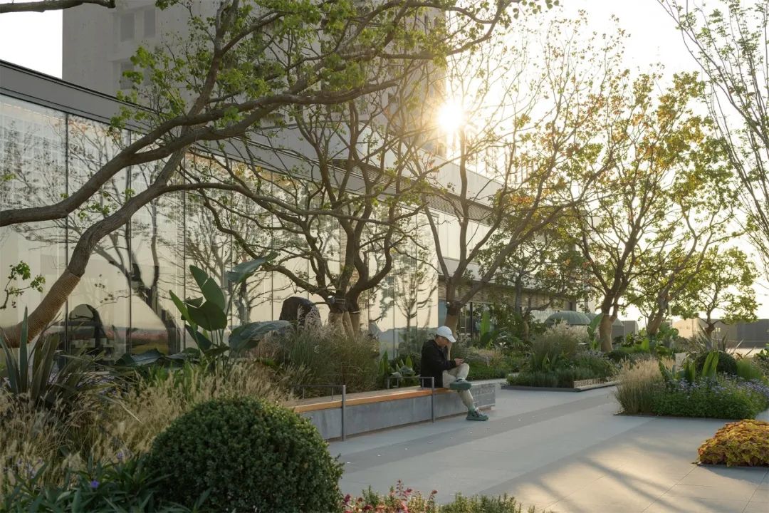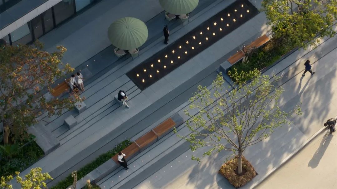 对细节的苛求是专业度与态度的体现。方案设计过程中团队一度面临挑战,经过反复推敲打磨,最终得到良好呈现。譬如,如何在满足视觉通透性的同时打造花园式游园体验?对此,本案选取分支点在2m以上的高分支点乌桕,种植点位对齐建筑实体柱,让位窗景,以保证室内视线开阔通透,让方山之景尽收眼底。其次,对于场地存在的高差问题,设计采用绿化结合种植池的方式进行消化,硬质部分的高差采用放坡处理,以保证商业步行动线的流畅性。此外,场地内置石均经过专门挑选并二次修饰,以贴合最理想的设计效果。