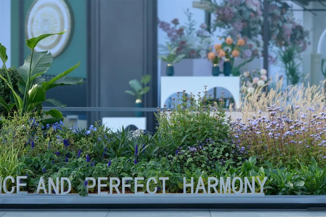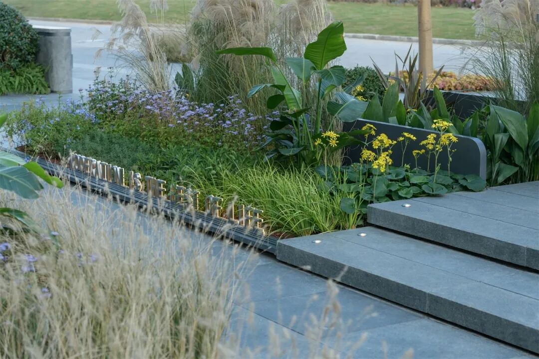 移步异景,别有韵味。踱步进入“无尽之境”,丰富独特的花境组团呈现出景观对自然的理解和思考;远处的金属板结合主题logo进行的细节刻画,彰显着精致细节。