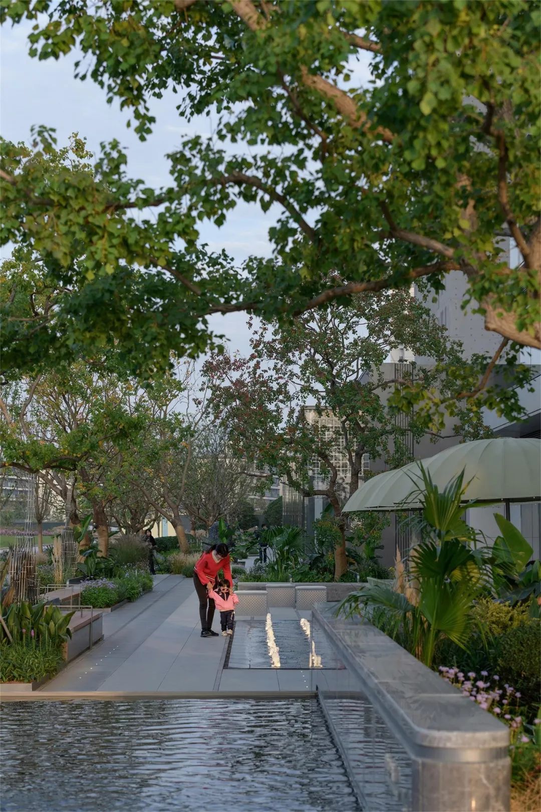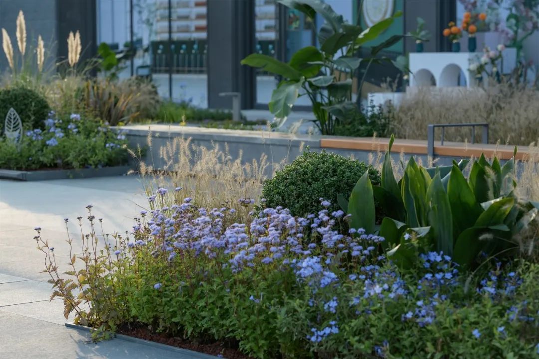花园组团错落而丰富,芙蓉菊、蓝雪花、马缨丹、荷兰菊等争相绽放,衬托着水的澄澈纯粹。景墙上嵌有“泊心于旷达 泊心于宽容”字样,呼应主题,于细节之处提升品质感。