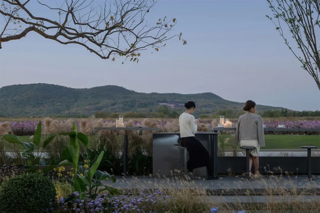 作为“泊心”主题的尽端,用丰富的绿化组团收尾,花境中露出的山石在收束中强化主题,让访客再次感知属于山的别样诗意。结合吧台增加主题LOGO细节,进一步强化主题。