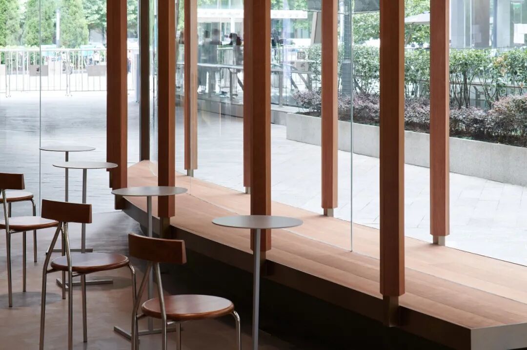 由樱桃木包裹的木质杆件把大尺度的立面降低为近人的尺度,生成了即开敞又有私密型的空间。通过让出与激活小部分红线内空间,削弱了公区的通道感,同时增强与外界人流的互动性。