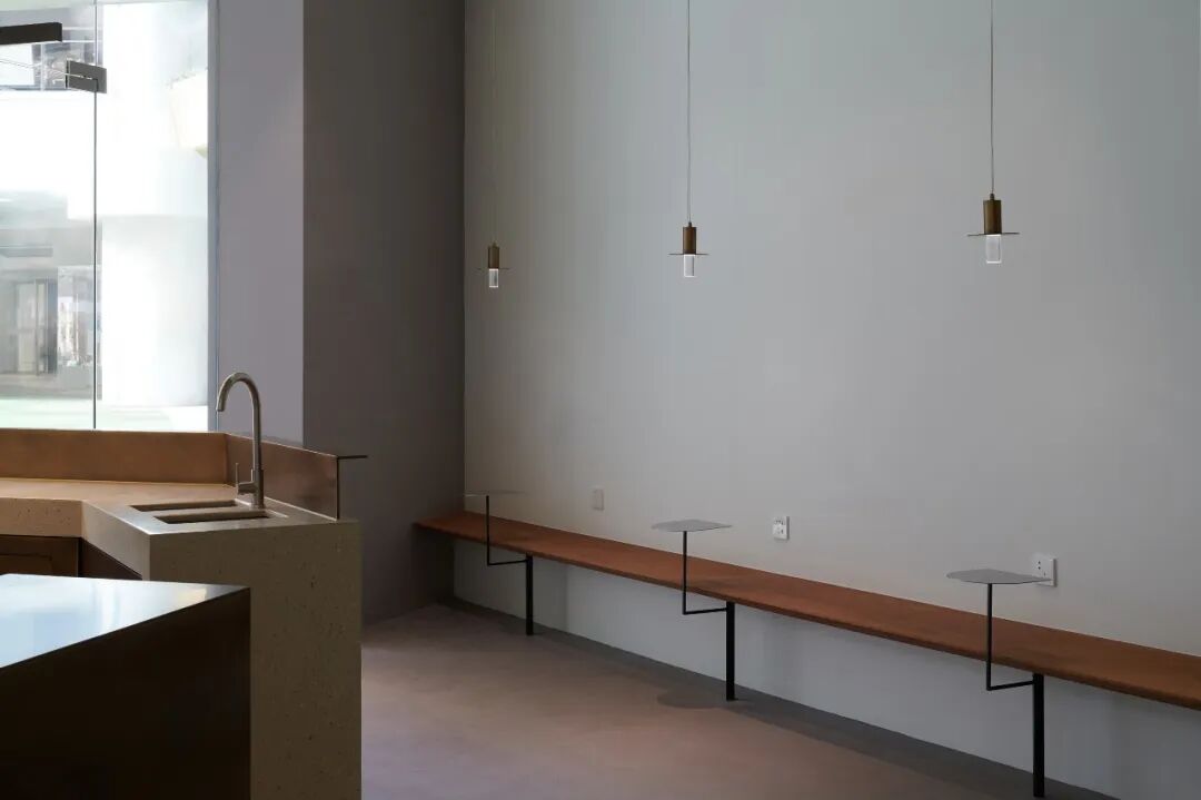 Kiosk 的存在感与重量感从端头出发,通过连续的、如洞穴般的水磨石结构,传递到店铺内部,雕刻式地形成了各式功能空间。