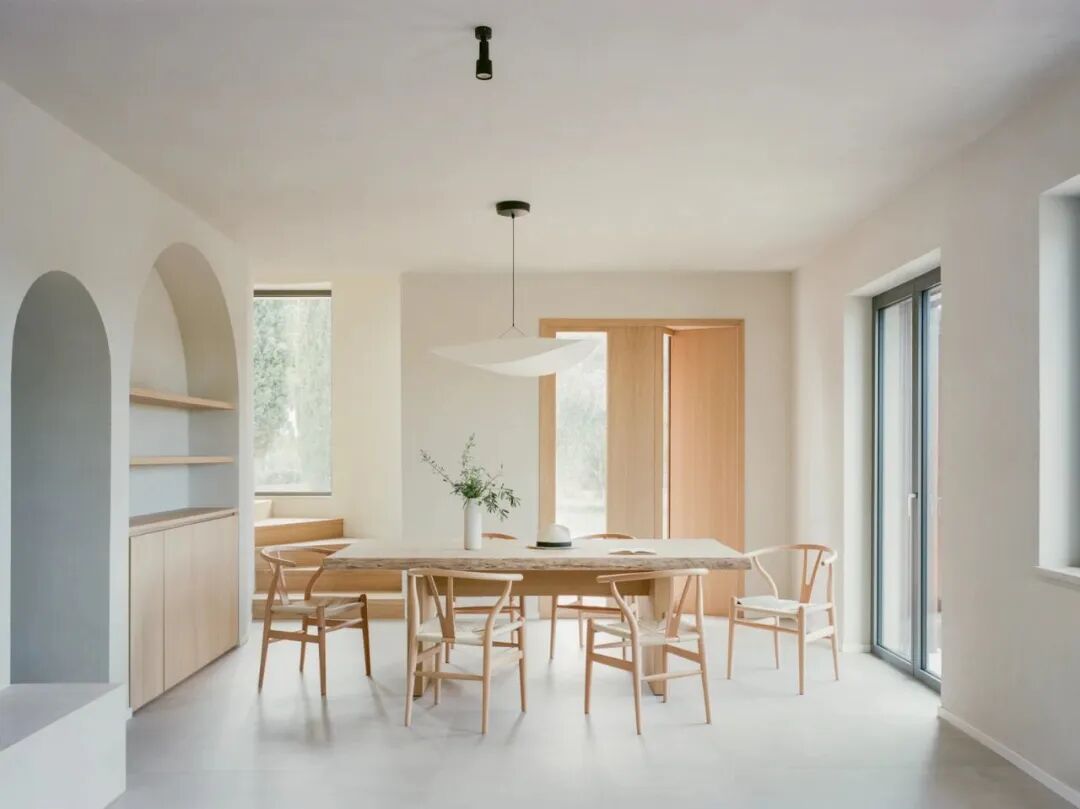 These rooms provide a continuous route to explore the home, where shared and private spaces coexist thanks to improvements and newly developed connecting spaces. The walk ends with terraces on the first floor, one of which was opened during the design process on the south side, where one can enjoy the light and shades of the surrounding environment. Both the interior and exterior surfaces of the farmhouse are distinguished by the use of clear geometric shapes and local natural materials. The travertine window frames, terracotta paving, arches and wooden furniture inside are evidence of this.